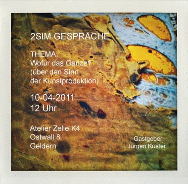 Juergen hat den „zweiten Sonntag im Monat“ als festen Treffpunkt in seinem Atelier benannt und lädt dann immer alle möglichen Leute zum offenen Gespräch ein. Das Thema gibt er meistens grob vor. Manchmal wird auch Kunst der Anwesenden vorgestellt. Woher er die Themen nimmt, bleibt sein Geheimnis. Es gibt keine Diskussionsleitung – daher ist es ein wirklich offenes Gespräch, auch in Bezug auf Länge und Qualität.