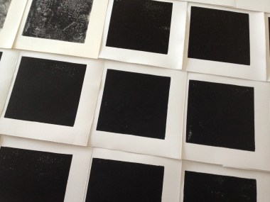 Ich wollte Juergen im Atelier „nur so“ besuchen und fand ihn in heller Aufregung. Und im Aufbruch. Er habe jetzt genug: das schwarze Quadrat mache ihn fertig. Dreißig Stück habe er jetzt gedruckt, per Hand, für die Weihnachtsedition von Boris, Rudolf, und ihm selbst, als Hintergrund, und jetzt könne er nichts mehr sehen. Er sei leer und ohne Bilder im Kopf, alles quadratisch, alles nur schwarz.