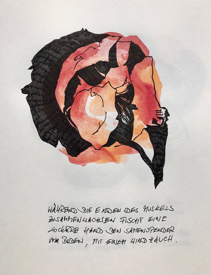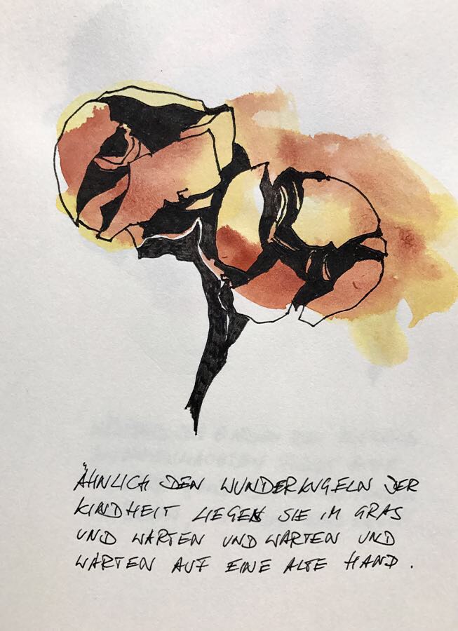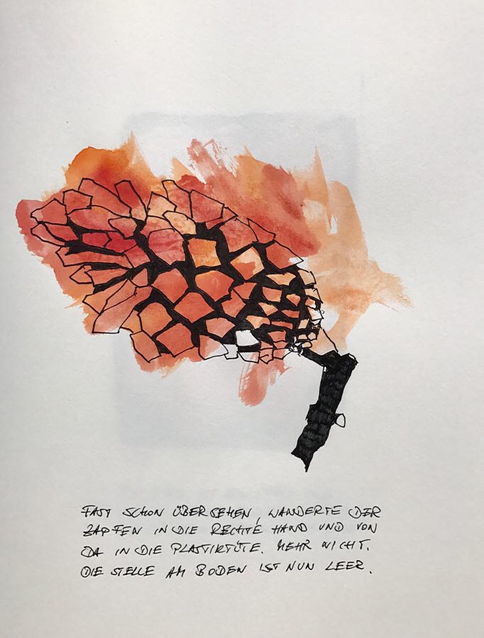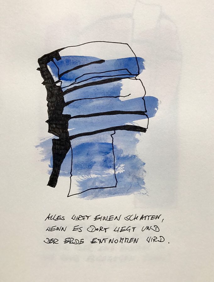 Und weiter: Zum Begreifen gehöre das Zeichnen. Hier ein paar Ergebnisse seiner Beschäftigung mit dem Ort, an dem wir seit ein paar Wochen stehen, OrtsMarken halt.