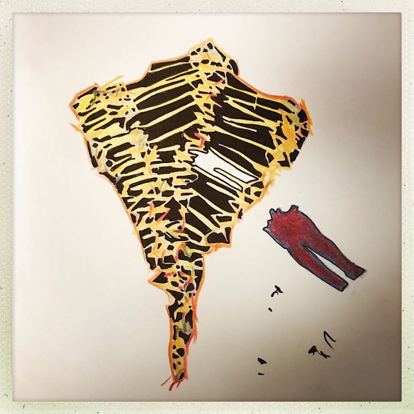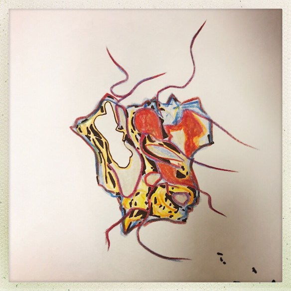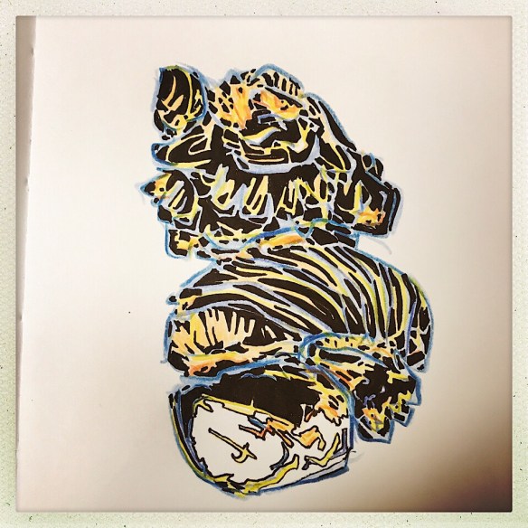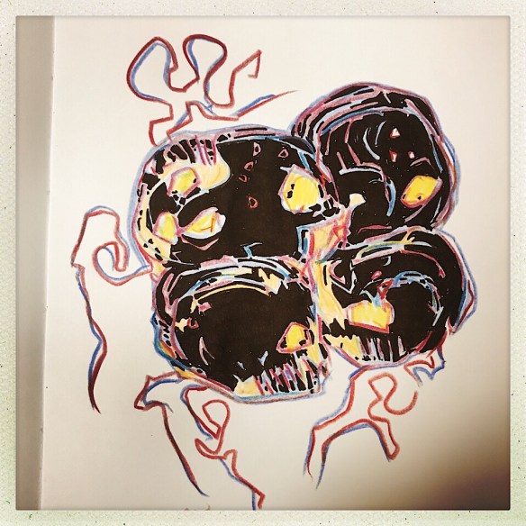So entsteht jeden Tag mindestens eine Zeichnung, oft mehr. Sie kreisen stets um diese kleinen Objekte, aber es gibt Abweichungen und wenn Juergen die erkennt, ergeben sich zeichnerische Seitenarme, die irgendwo hinführen. Einiges verfolgt er dann weiter. So die Türme oder Gesichter.