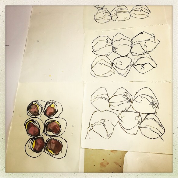 In letzter Zeit, so Juergen, würden seine einzelnen Motive in den Zeichnungen und auf den Blättern einfach so im Blatt stehen, im Raum, isoliert. Kein besonderer Hintergrund. Nur das Weiss des Papiers. Ab und an fänden sich noch versprengte Punkte oder Flecken. Das sei es dann. Der Hintergrund sei ihm irgendwie abhanden gekommen.