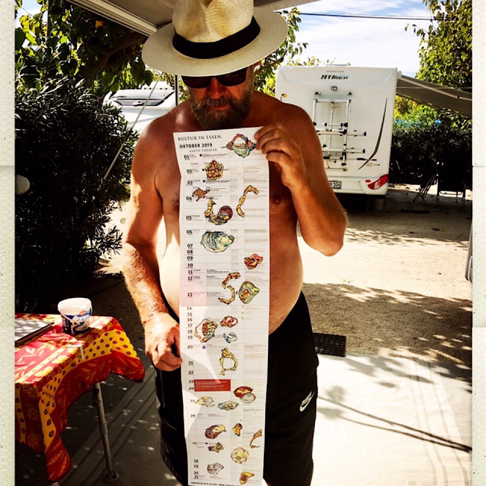 Wir haben den 4ten Oktober und Juergen arbeitet an seinen Muschelzeichnungen. An irgendetwas erinnert mich das.