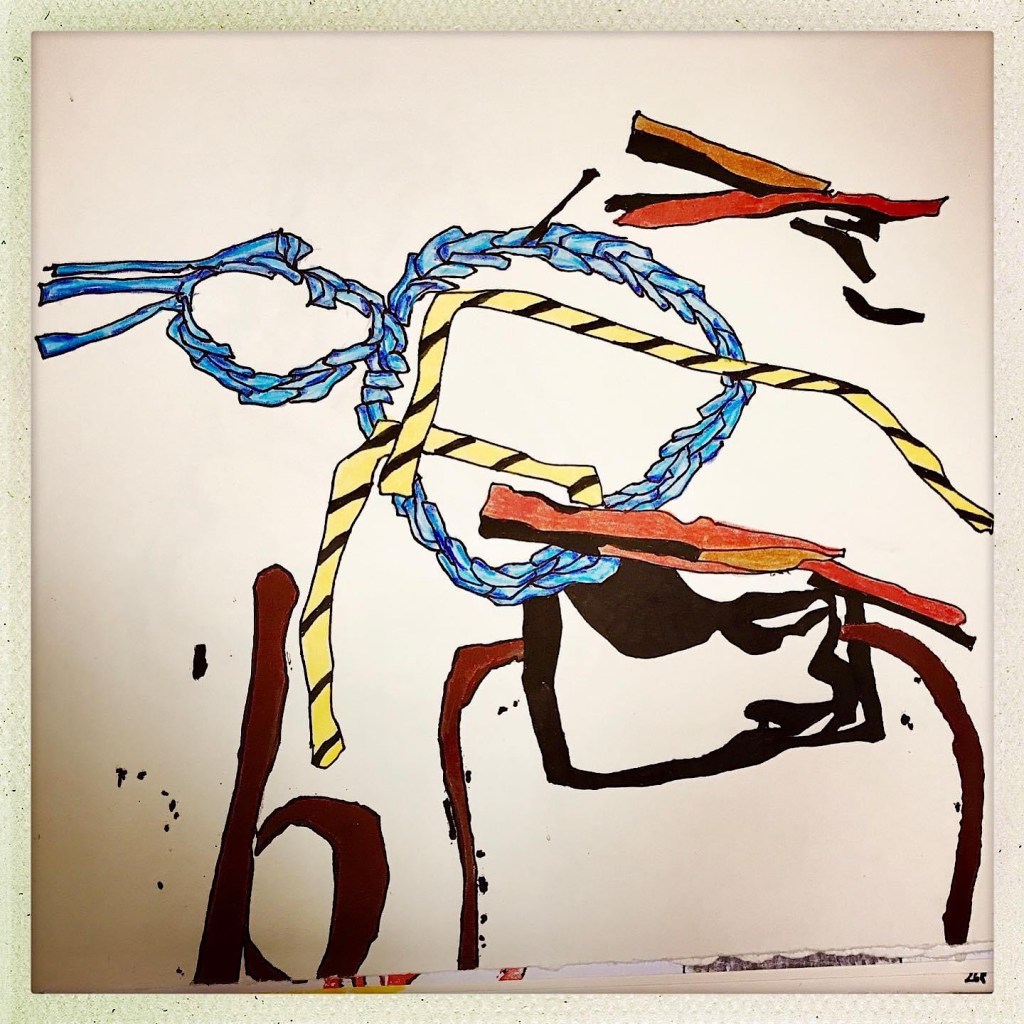Jürgen weiß aber, dass er mit seinen literarischen Fähigkeiten keinen Blumentopf gewinnen kann. Das Bild jedoch, die Schlange, das kennt er. Zeichnerisch hat er schon mal Ähnliches hingekriegt, im letzten Jahr bei „den Akkrum – notes“. Und bei „Latos Schnüren“. Dabei gilt: Die Schlange ist die Linie, die Schnüre sind die Linie und erst recht die Seile in Akkrum.