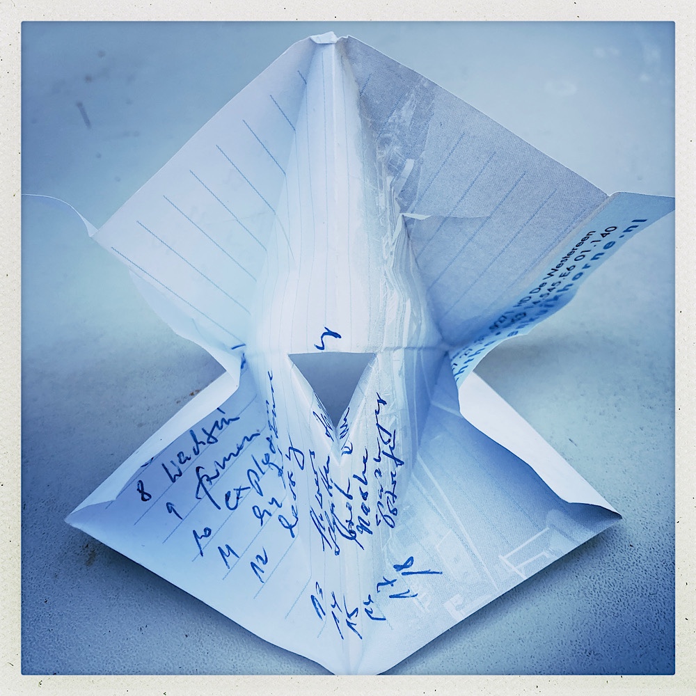 Es wird hier vor Ort im Wohnmobil, Jürgen und ich sind momentan in Spanien, einiges gezeichnet bzw. skizziert, und das Ergebnis taugt nicht immer. Kommt ja vor. Na, dann faltet und klebt Jürgen etwas aus dem verbliebenen Blatt, ohne Plan, ohne Sinn und Verstand, und während er dies tut, öffnet sich in der Regel ein thematisches Türchen.