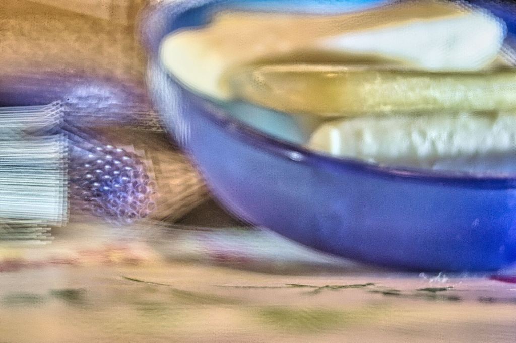 Buchalov sagt zu seinem Foto: „Ich schaue beim Spülen ins Spülbecken und bin fokussiert auf den zu reinigenden Gegenstand. Das durch das Spülmittel blasenbildende Wasser habe ich nicht im Blick. Das hat sich durch das Vorgängerbild, bei dem die Seife im Mittelpunkt stand, geändert. Jetzt beobachte ich die Blasen und benötige mehr Zeit zum Spülen. Das Thema „Reinigung“ ist das Verbindende zum Vorgängerbild. Fotografisch bot sich die Siebblende an, klar, wegen der Blasen im Wasser.“