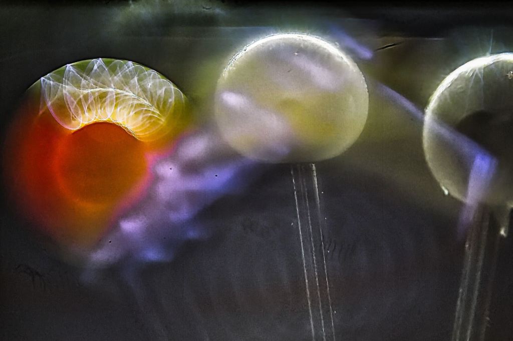 Buchalov sagt über sein Foto: „ Der Löwe besitzt ein Objektiv, das er „das Biest“ nennt. Es kann auf eine ganz besondere Art und Weise mit Lichtreflexen umgehen und erzeugt Effekte, die, so der Löwe, auch mit KI wohl nicht erreichbar sind. Ein solches Objektiv besitzt Buchalov nicht. Er hat sich daher auf das konzentriert, was er besitzt und was er mit seinen Mitteln kann. Er hat den linken Teilbereich des Bildes als Ausgang für sein Photo genommen und diesen mithilfe von Papier, Schneidemesser und Kleber nachgebaut, auf seine Fotobühne gestellt und mit künstlichem Licht fotografiert. Nachbearbeitet wurde nur minimal: der Kontrast, die Helligkeit und der Bildausschnitt. Die fotografische Herausforderung bestand darin, der leuchtenden Spannung des Vorgängerbildes etwas entgegenzusetzen und es doch irgendwie fortzuschreiben – es war schwierig, schwierig.”