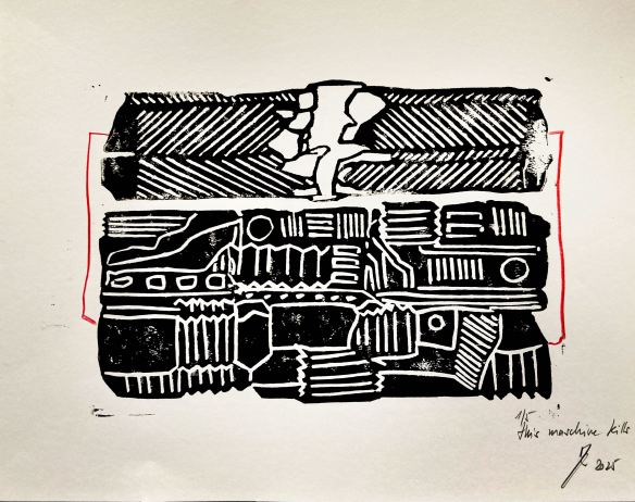 Eine zentrale Druckplatte und ihre drei Variationen, mit den Titeln: this maschine kills, eherNo und no kings, entstanden zwischendurch, weil Jürgen mal Lust auf etwas anderes hatte.