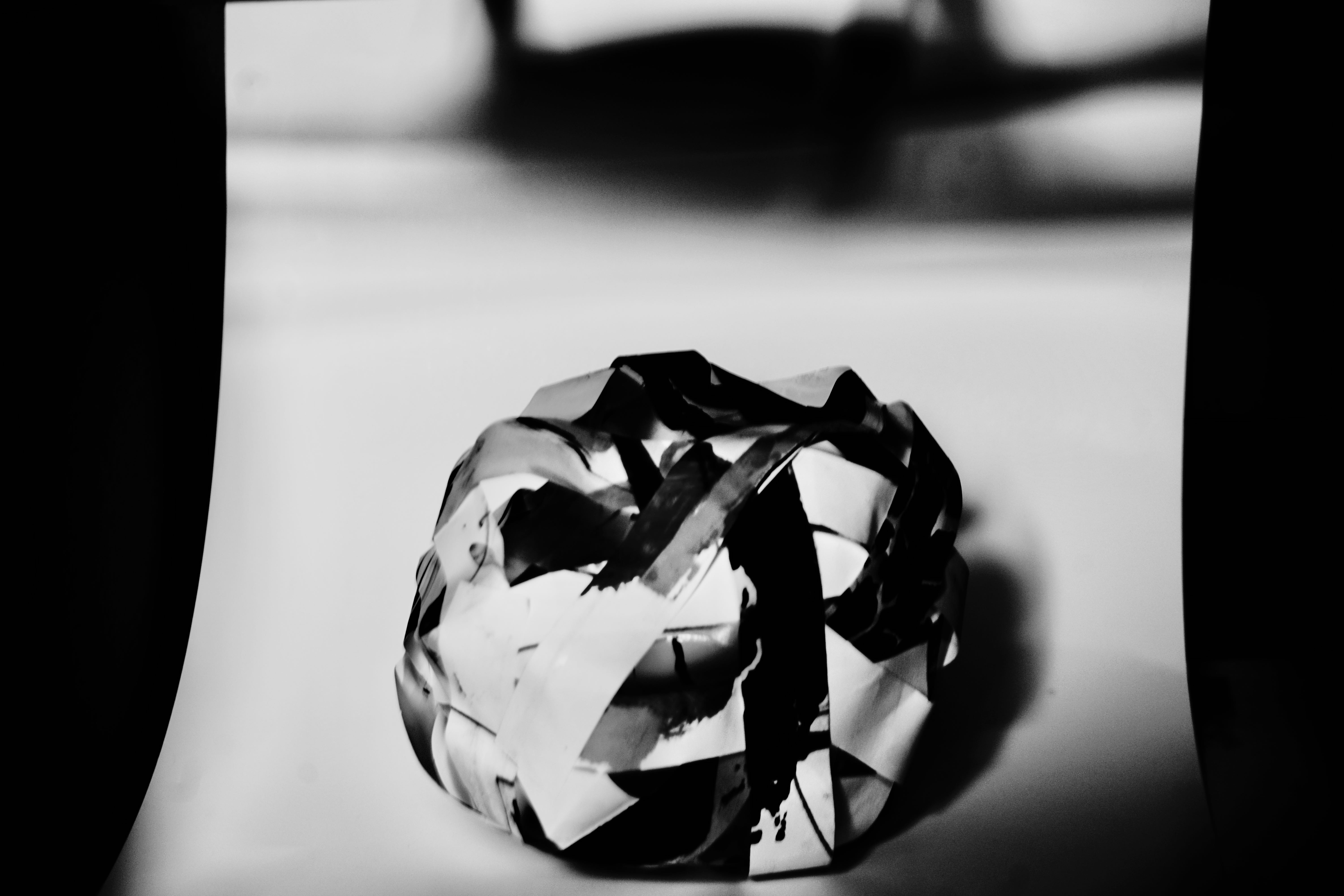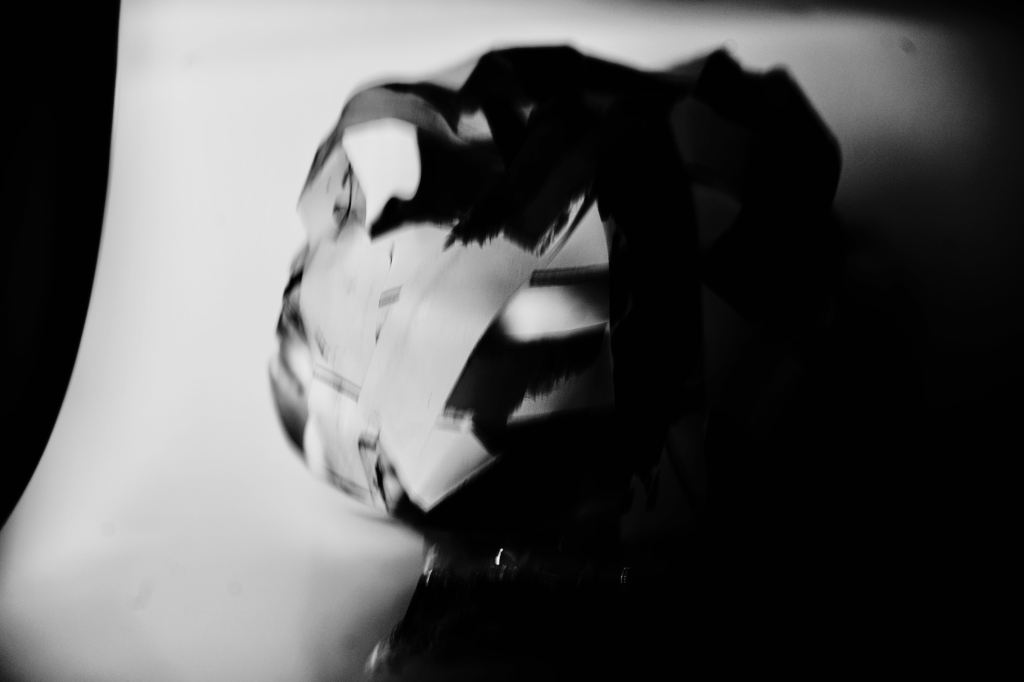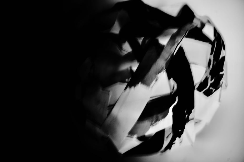Buchalov sagt zu seinem Foto: „Das Ausgangsbild kam bei mir kugelmässig rüber: eine Kugel? Eine Raumstation? Beim Durchstreifen im Atelier fand ich dann eine größere Papierkugel. Sie wurde auf der „Papp-Bühne“ platziert und bei grauem Tageslicht ohne zusätzliche Beleuchtung fotografiert, mit der Sony A7 II und einem Nikon Sigma Zoom 28-105mm. Die Entscheidung für schwarz/weiss war durch das Vorgängerbild vorgegeben. Die Unschärfe war gewünscht. Und die Kugel sollte angeschnitten werden – wegen der Komposition. Das wars.“