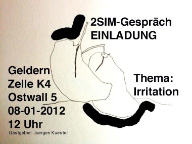 Juergen hat wieder eingeladen – zu den 2SIM Gesprächen. Jeden zweiten Sonntag im Monat hat er sich – mit Unterbrechungen – seit Januar 2009 mit Freunden und Kunstinteressierten in seinem Atelier zu allen möglichen Themen getroffen und geredet und ausgetaucht. Man hat sich Kunst gezeigt und gemeinsam einen Beitrag zur Vernetzung in der „Szene Niederrhein“ geliefert. Juergen ist stolz auf diese Treffen. Und voller Vorfreude auf Sonntag.