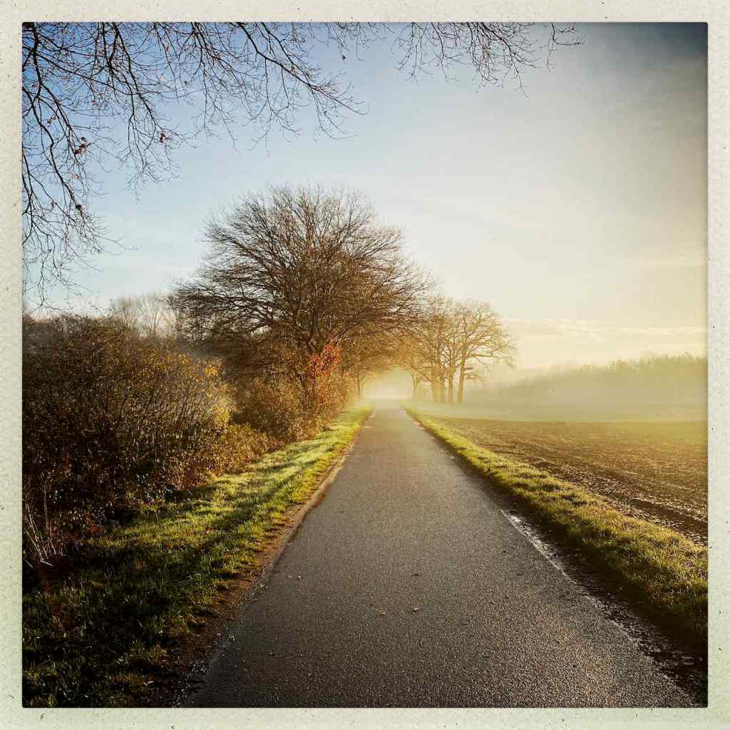 So sehen am Niederrhein die Wirtschaftswege im Frühnebel aus – wie so viele andere Wirtschaftswege hier und woanders.