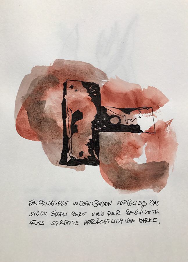Und weiter: Zum Begreifen gehöre das Zeichnen. Hier ein paar Ergebnisse seiner Beschäftigung mit dem Ort, an dem wir seit ein paar Wochen stehen, OrtsMarken halt.