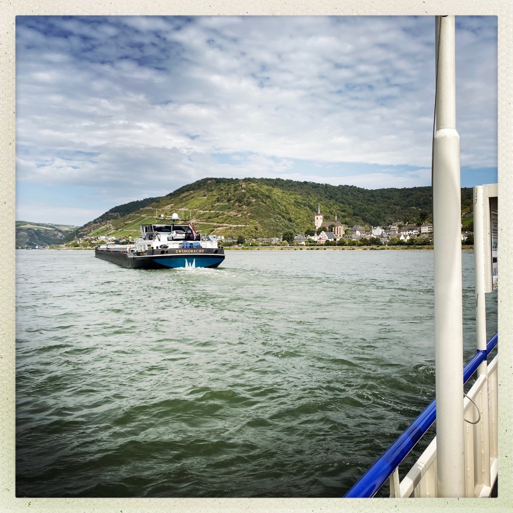 Über Mittag hatten wir einen Energieschub. Also wurde gespült, Fahrrad gefahren, die Toilettenkasette geleert und Nachdenkenswertes gezeichnet. Die kleine Fahrradtour ging über Oberweser, Bacharach, Lorch und Kaub incl. zweimal die Rheinfähre. Es ist traumhaft schön hier. Das findet auch Jürgen.