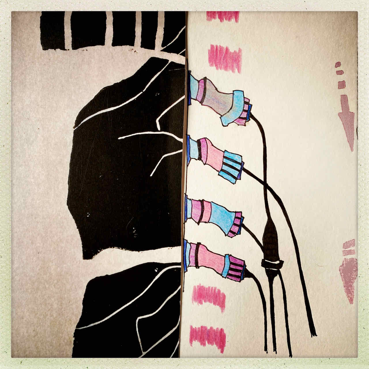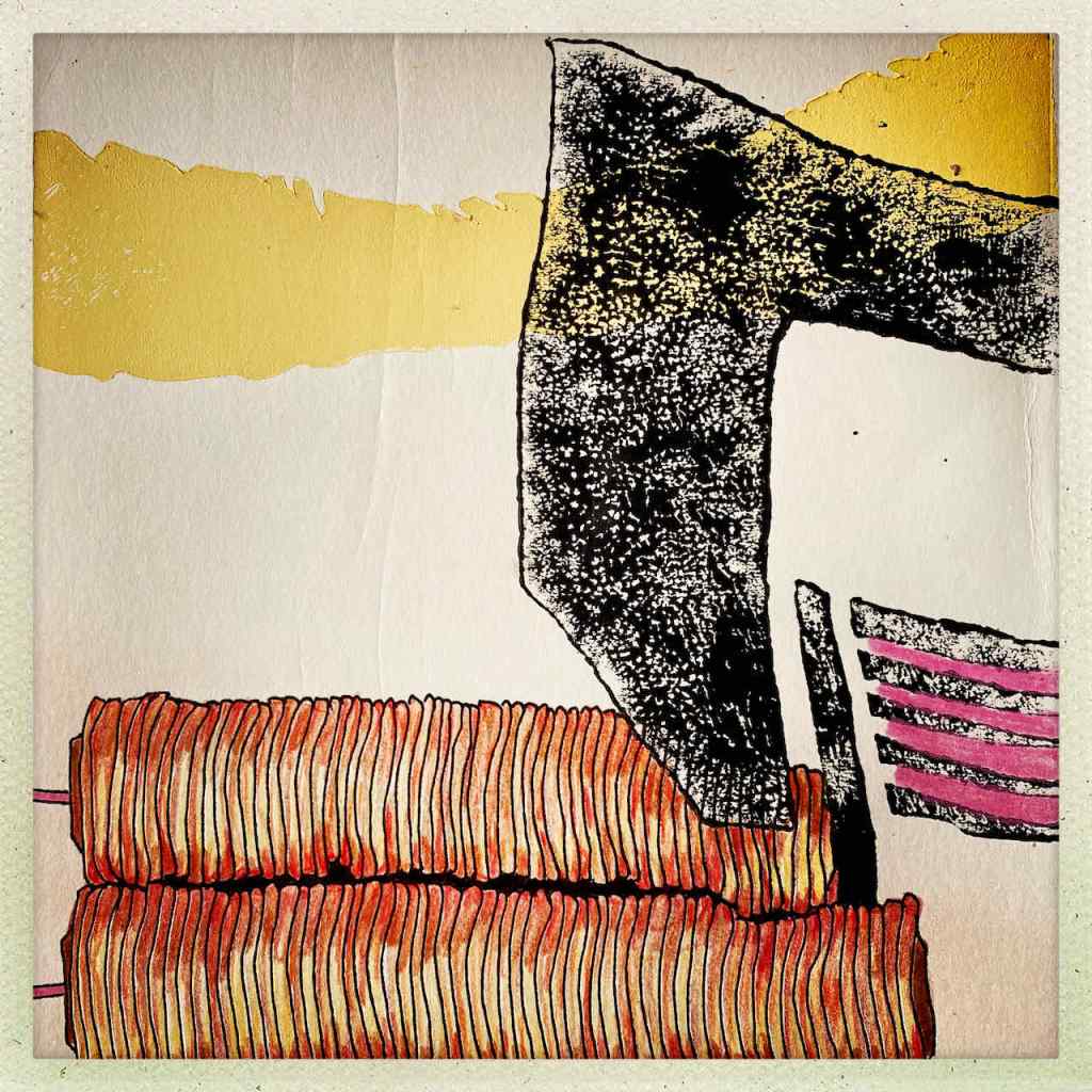 Es gab da ein Motiv in Juergens „BFT2019 – Skizzenbuch“. Und es gab da ein Reststück Linolium. Beides fand nun seinen gemeinsamen Weg in die Überdruckung von Restepapier und das wiederum findet seinen Weg in in das Thema „BFT2019 Remember“. Klingt kompliziert. Ist es vielleicht auch. Und das hat mit Jürgens Ansatz zu tun, dem rhizomartigen Vorgehen. Klingt auch kompliziert. Also, so Juergen, solle ich mal lieber die Ergebnisse zeigen. Was ich hiermit tue: