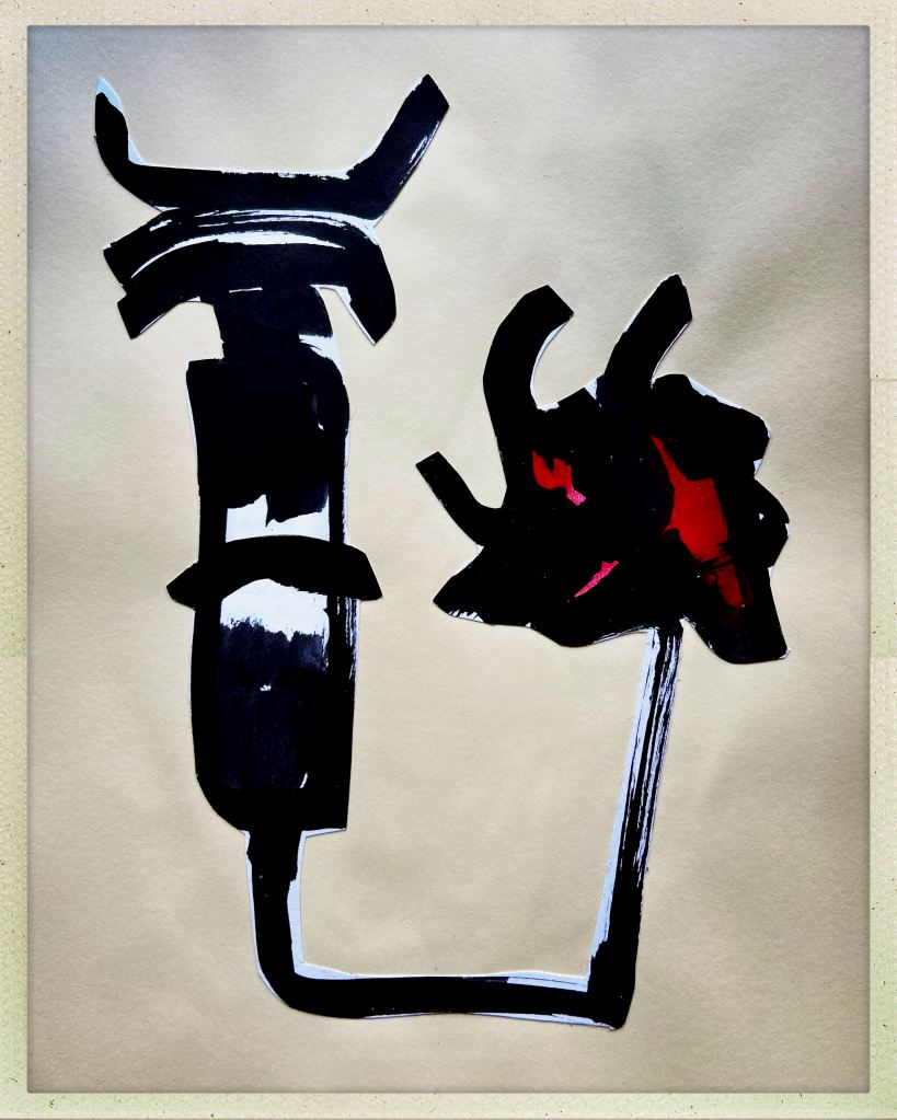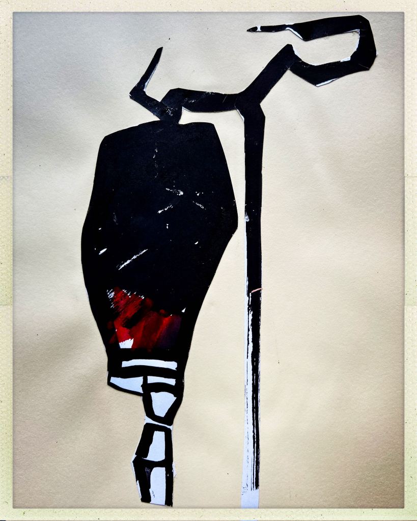 Auf meinem kleinen Zeichentisch im Atelier unterm Dach fand ich einen „Dengel“. Dengel sind kleine Plastiken, die ich aus Restepapier bzw. Pappe baue und die symbolisch für die Kraft /Energie stehen, die ich momentan benötige. Der wurde nun auf meine kleine, provisorische Bühne aus Karton gepackt. Stangen, Licht und Kabel wurden hinzugefügt und es wurde fotografiert, fertig! Ich sah Parallelen zum Foto des Löwen.
