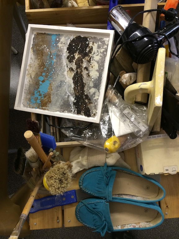 Dann habe ich mich auch mal umgeschaut, das habe ich schon lange nicht mehr getan, und festgestellt, das Juergen Depots und Materialhaufen im Raum verteilt hat: Bilder, Fundstücke, Skizzen, Blätter, Fotos, Kopien und so was halt. Man kann das Ordnung nennen. Man kann das auch Suche nennen. Oder gedankliche Stolperfallen. Oder die Suche nach Sicherheiten. Oder Verbindungen. Na ja!