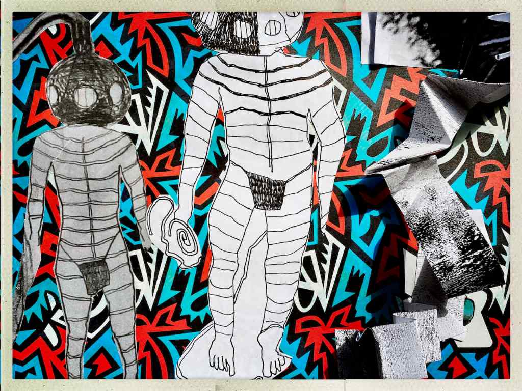 Das Projekt “Projektohnenamen” geht also weiter. Dabei schicken sich Susanne Haun und Juergen gegenseitig Halbsätze zu, die der andere vervollständigen soll und zusätzlich visualisiert: alles ist dabei möglich. Jürgen benutzt dazu Dekobögen, altes Restepapier und kleine Druckstöcke aus seiner Kiste für Kleines. Er zeichnet, klebt und druckt. Den Antwortsatz hat er grob im Kopf, der Restergibt sich während des Arbeitens. Das Material diktiert das so manches.