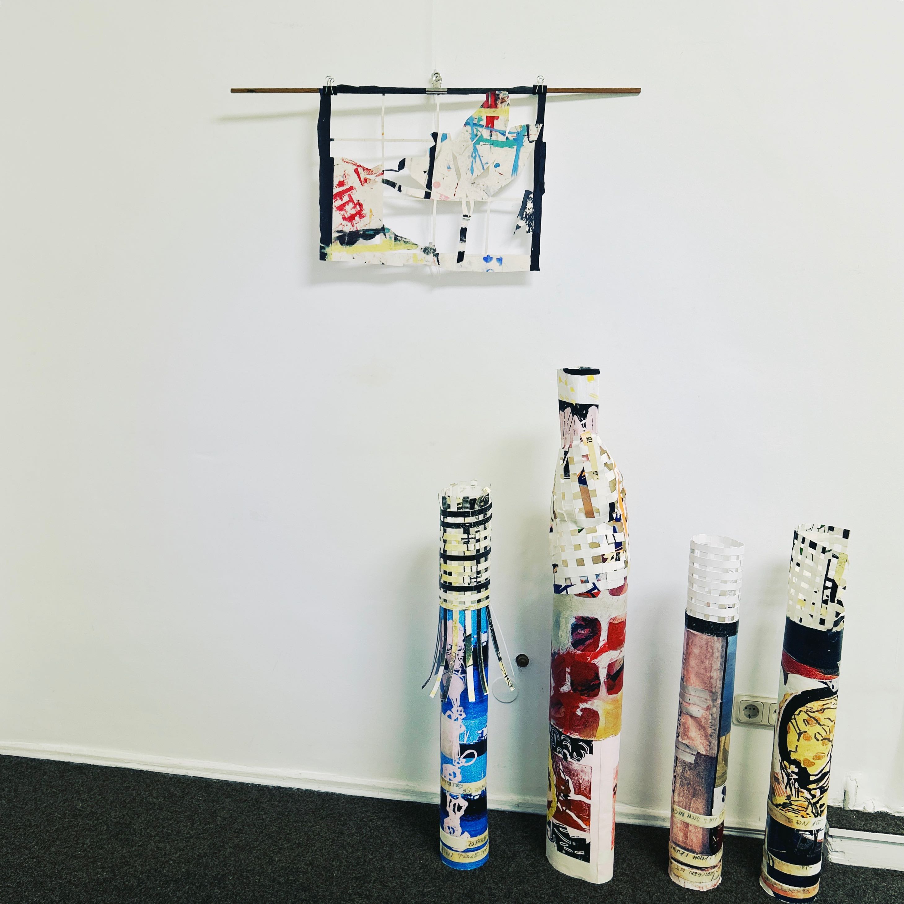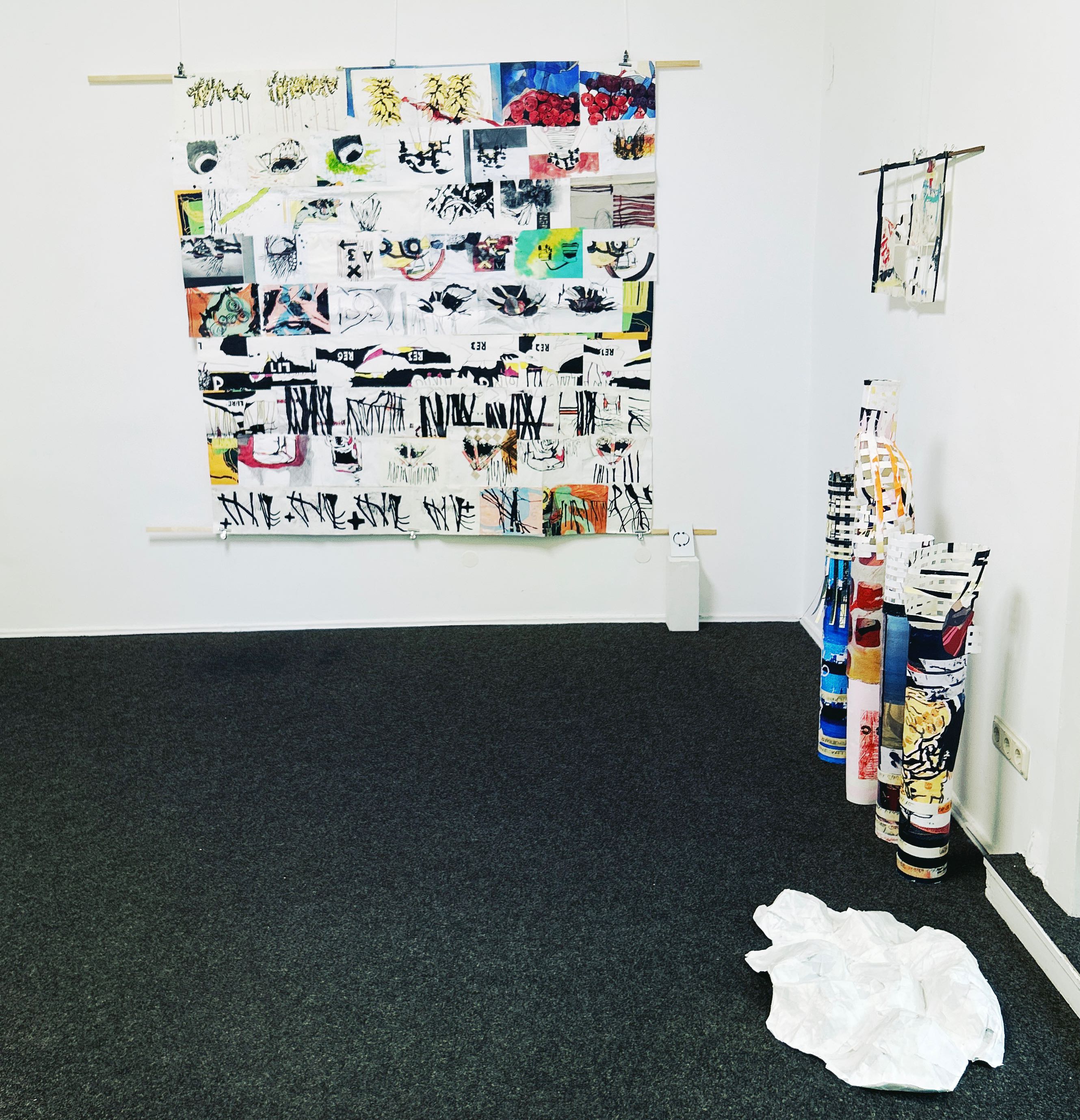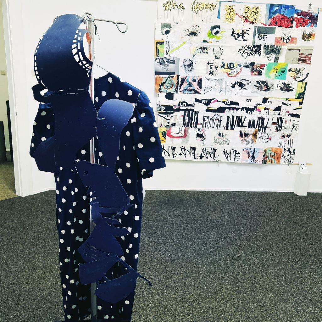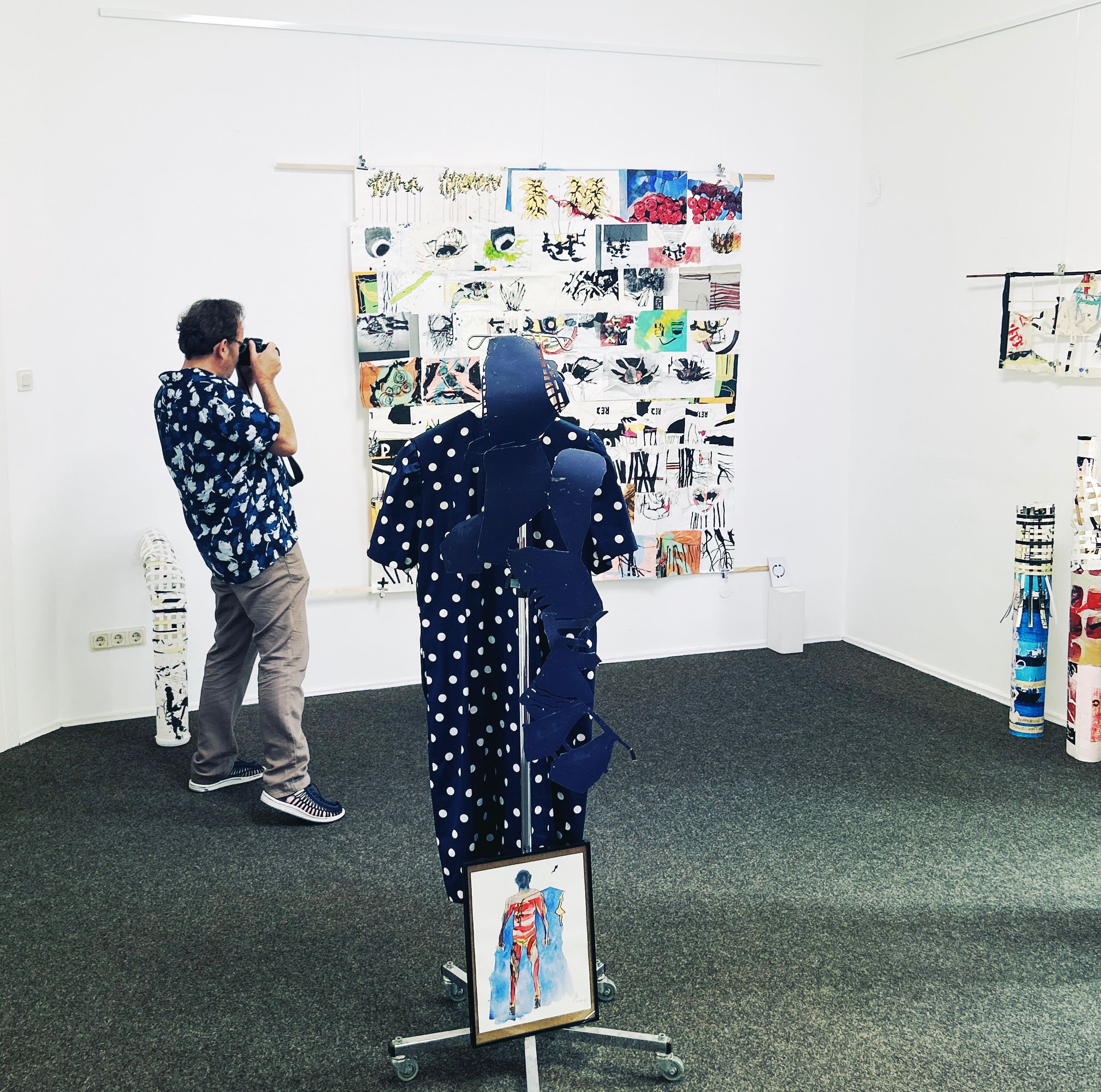 Jürgen sagt: “Ein Raum für mich ganz allein: das hat schon was“. Im Atelier hat er einiges zusammengesucht unter den Begriffen „Hoffnung / Ort /Dengel / light side mix und dann nach Mühlheim verfrachtet. Im Ausstellungsraum haben die einzelnen Exponate fast von selbst ihren Platz gefunden. Es sollte wie zufällig platziert wirken, was natürlich Quatsch ist, denn ein absichtloses Arrangieren gibt es nicht. Er habe es danach so gelassen, wie es war.