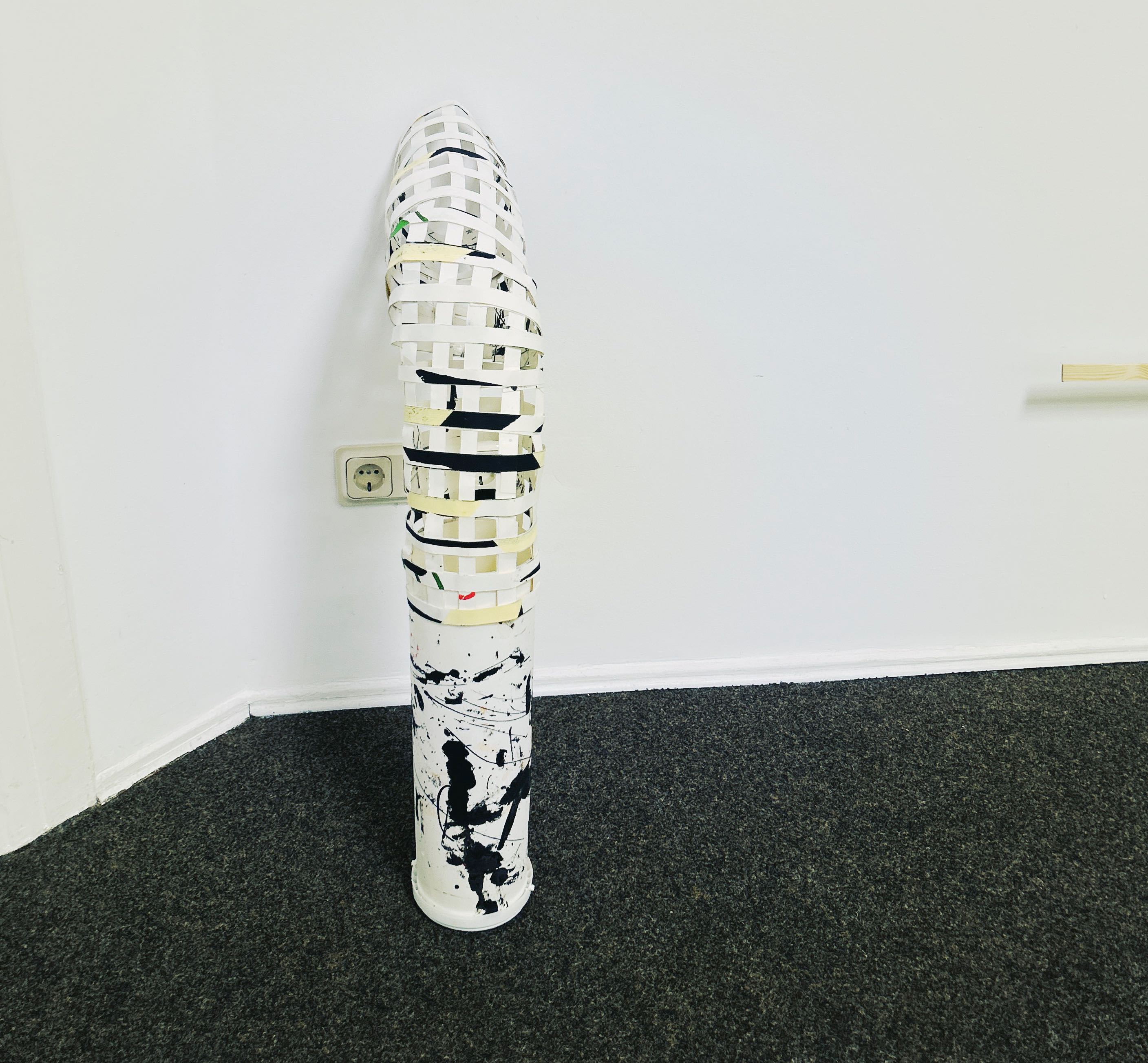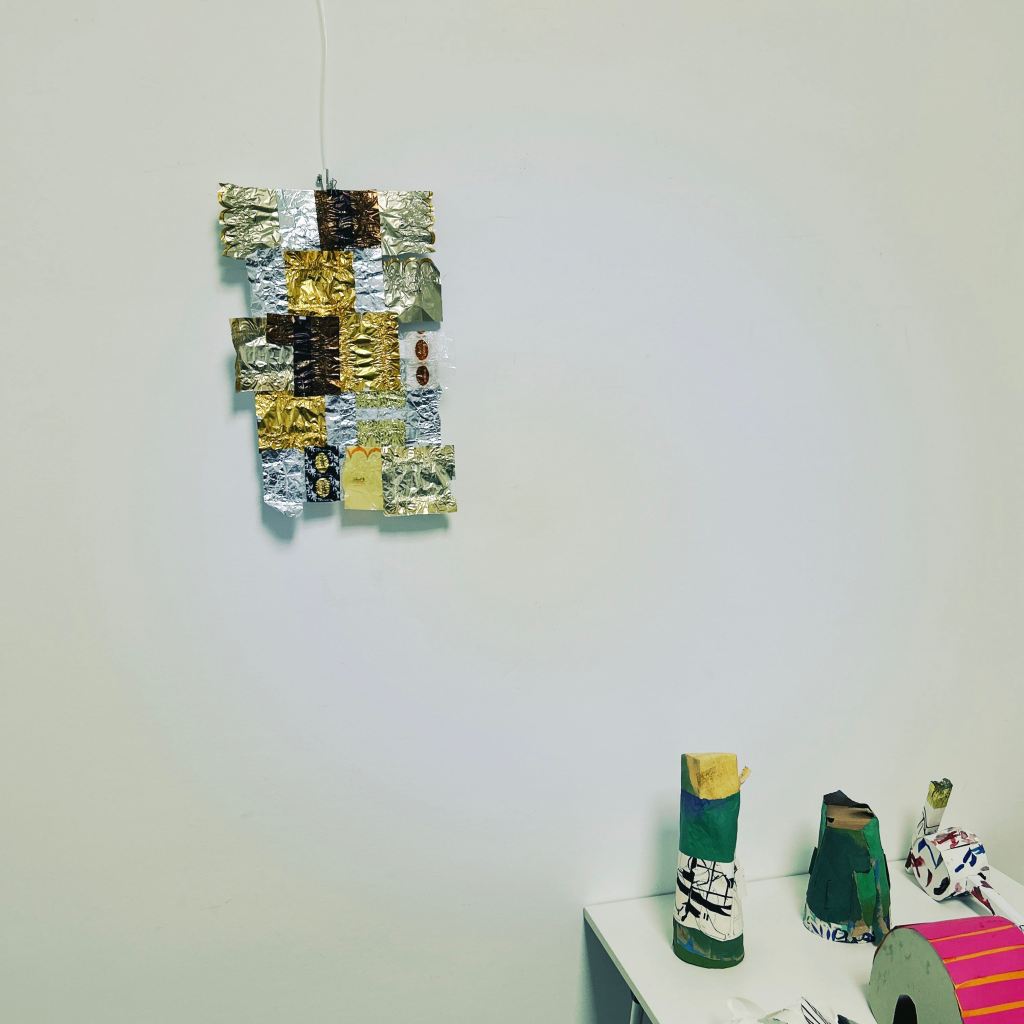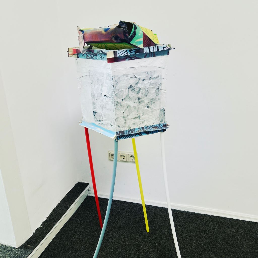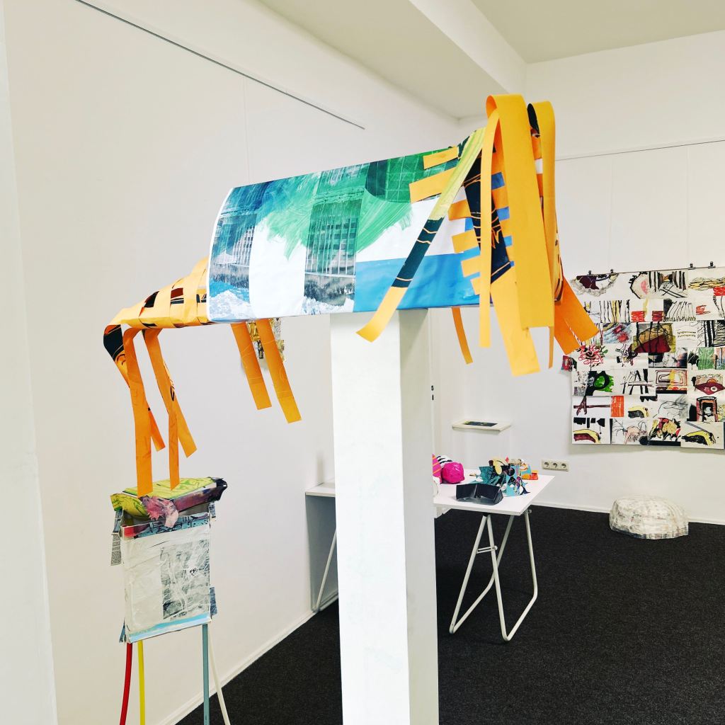 Jürgen sagt: “Ein Raum für mich ganz allein: das hat schon was“. Im Atelier hat er einiges zusammengesucht unter den Begriffen „Hoffnung / Ort /Dengel / light side mix und dann nach Mühlheim verfrachtet. Im Ausstellungsraum haben die einzelnen Exponate fast von selbst ihren Platz gefunden. Es sollte wie zufällig platziert wirken, was natürlich Quatsch ist, denn ein absichtloses Arrangieren gibt es nicht. Er habe es danach so gelassen, wie es war.