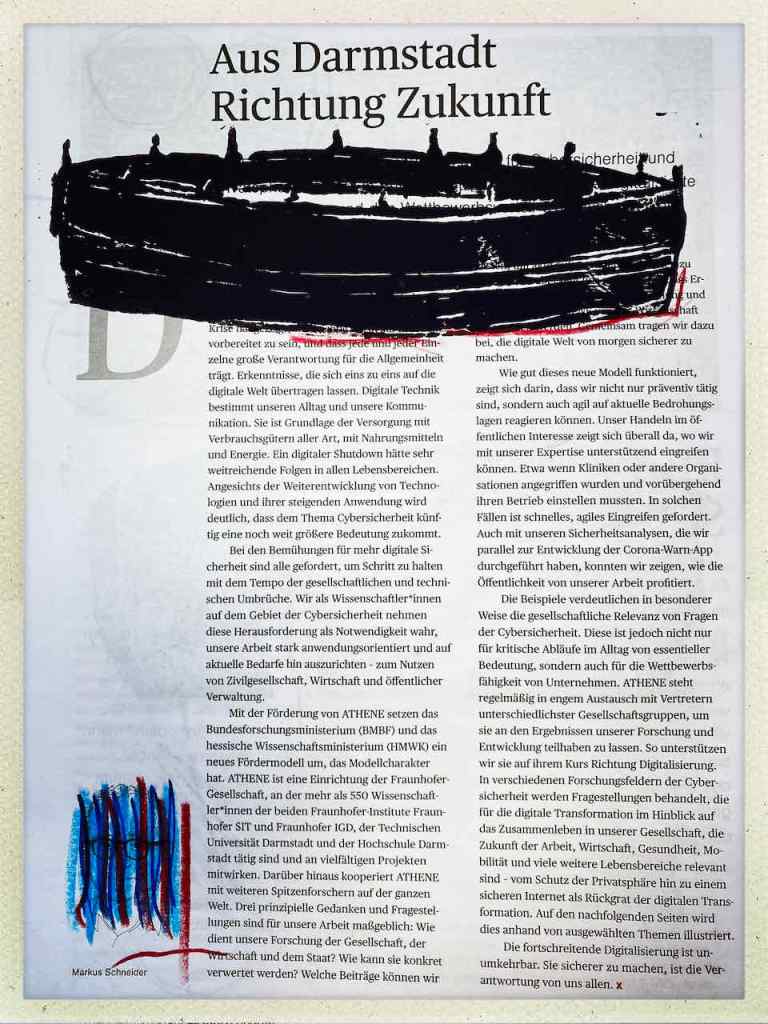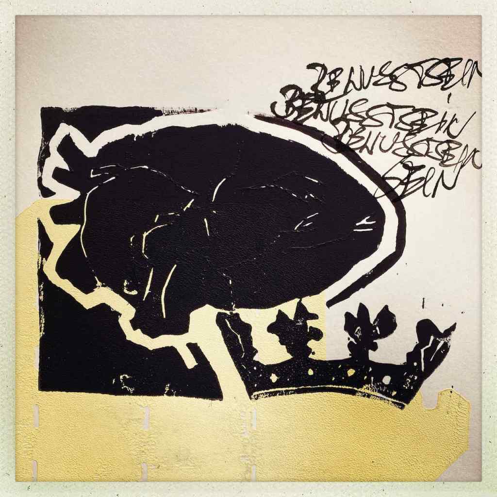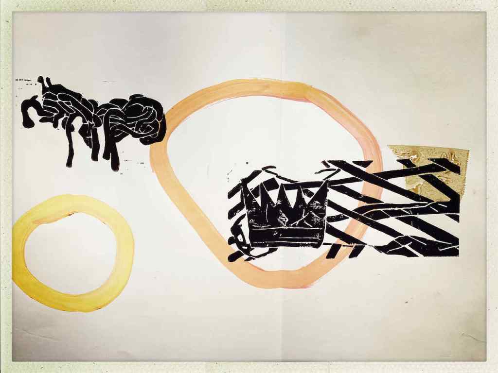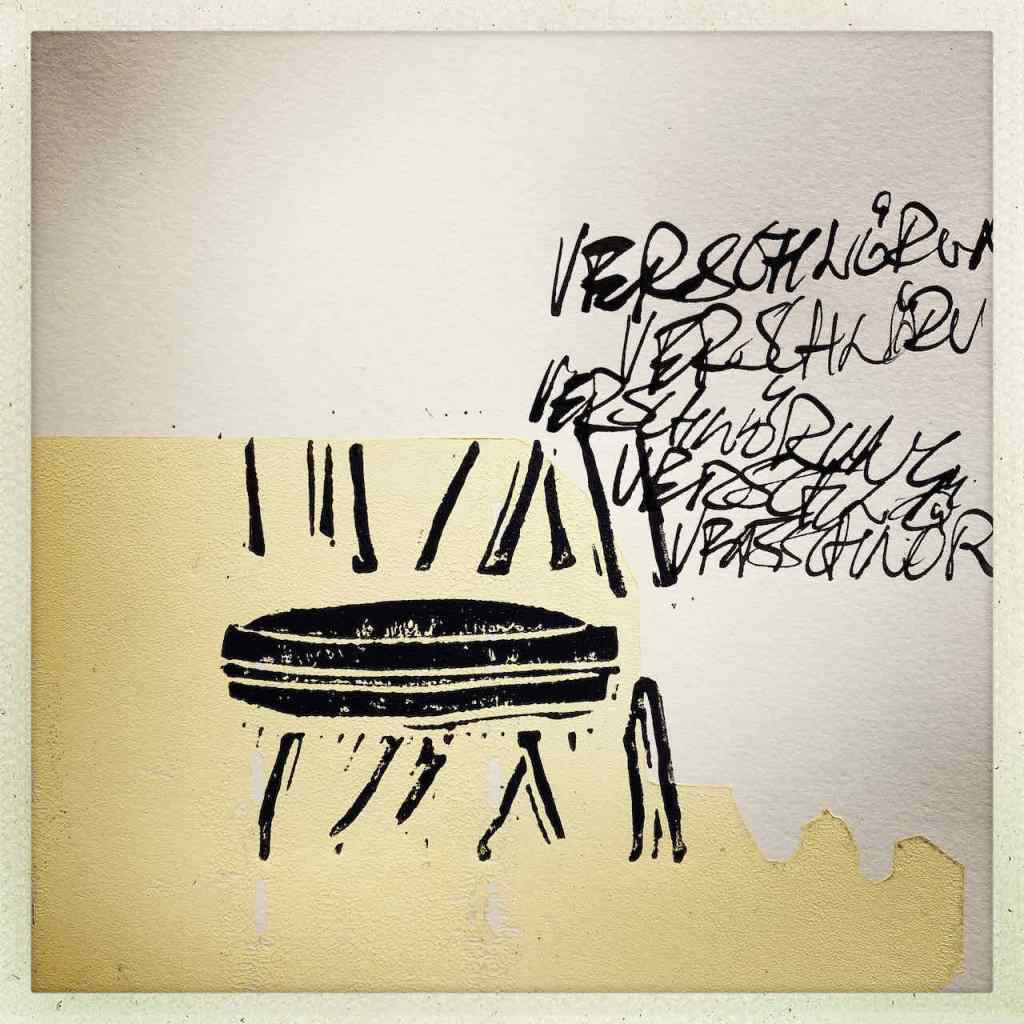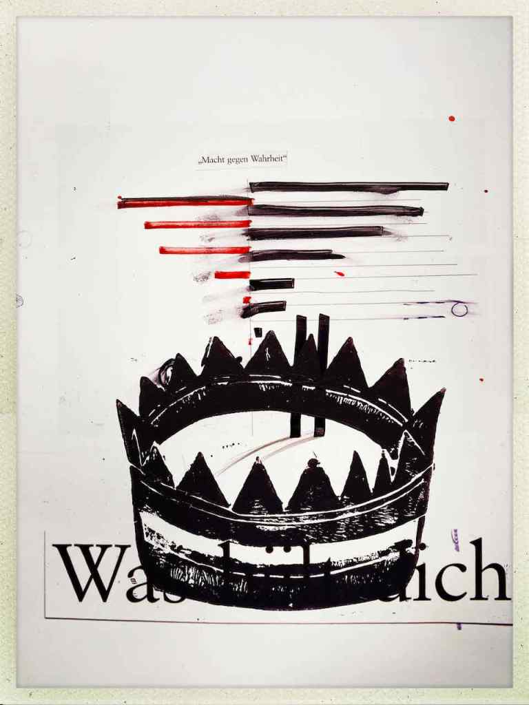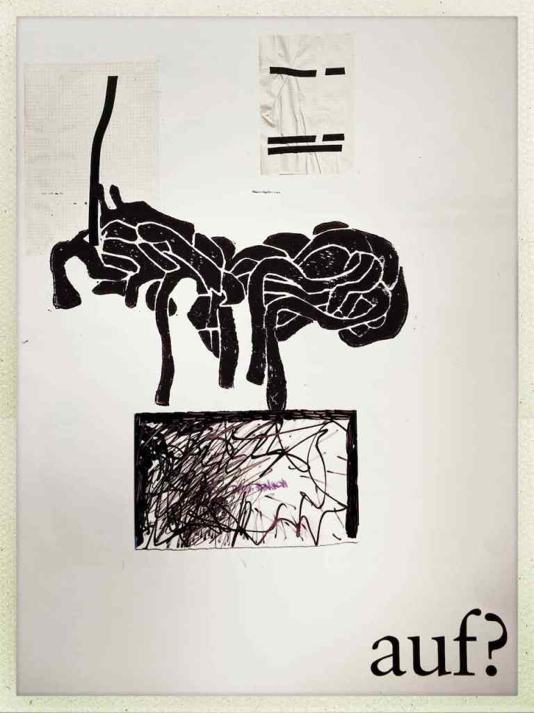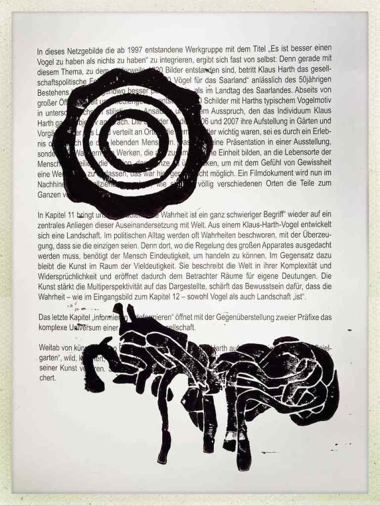Gefunden hat er dann einen Ausstellungskatalog von Klaus Harth, Landtag Saarbrücken, Jahr 2011. Den hat er von ihm auf einer der Buchalovs Touren geschenkt bekommen. Und Den hat er zerschnitten, die Einzelblätter sortiert – was springt mich an und passt zu meinen Motiven – so irgendwie – und dann bedruckt, mit seinen Linolschnitten. Klaus Harth hat sein Einverständnis zur Veröffentlichung gegeben. Jürgen meinte zu mir, das Klaus ein feiner Kerl sei, guter Künstler und ein Freund von Collaborationen, genau wie er. Hier einige Überdruckungen: