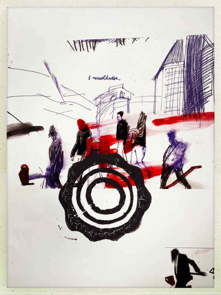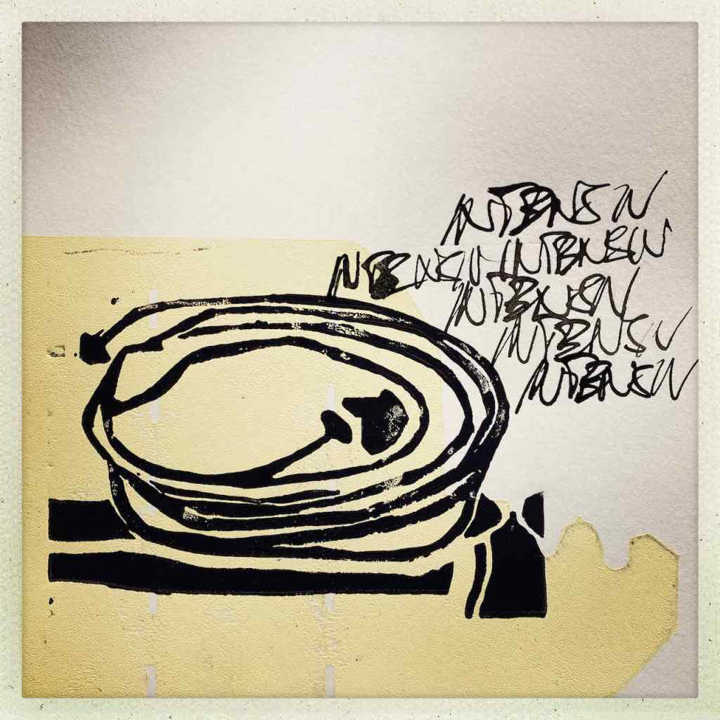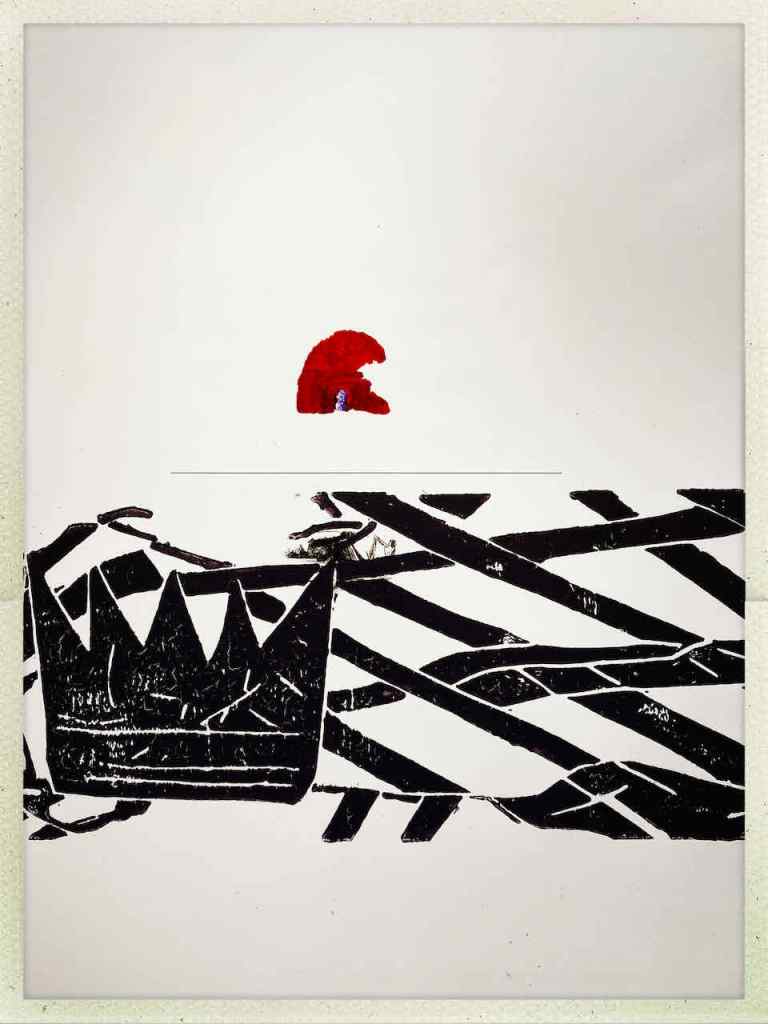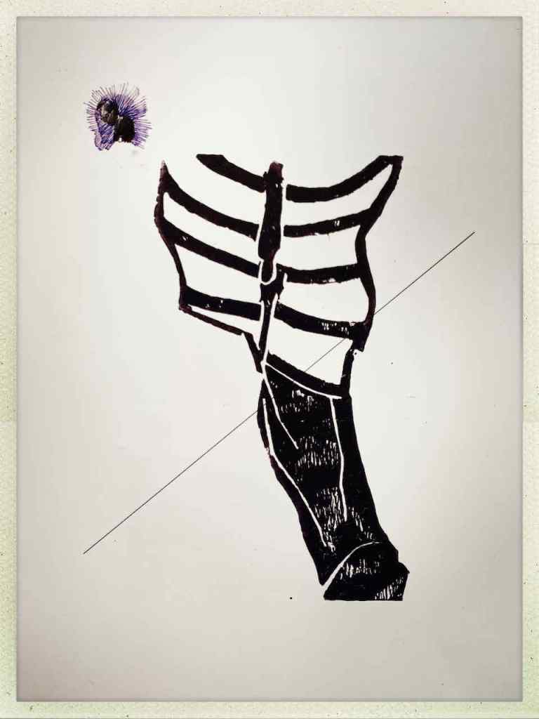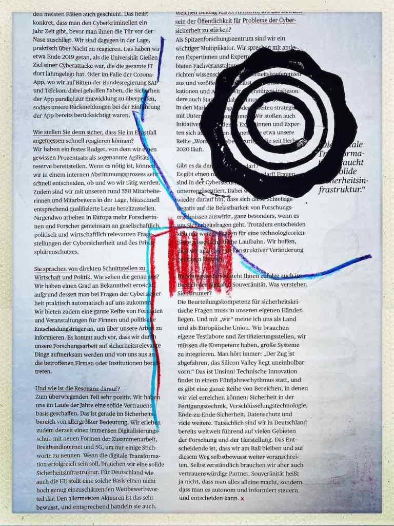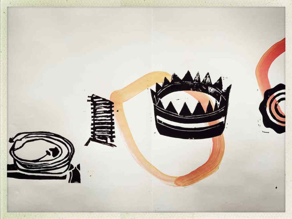 Gefunden hat er dann einen Ausstellungskatalog von Klaus Harth, Landtag Saarbrücken, Jahr 2011. Den hat er von ihm auf einer der Buchalovs Touren geschenkt bekommen. Und Den hat er zerschnitten, die Einzelblätter sortiert – was springt mich an und passt zu meinen Motiven – so irgendwie – und dann bedruckt, mit seinen Linolschnitten. Klaus Harth hat sein Einverständnis zur Veröffentlichung gegeben. Jürgen meinte zu mir, das Klaus ein feiner Kerl sei, guter Künstler und ein Freund von Collaborationen, genau wie er. Hier einige Überdruckungen: