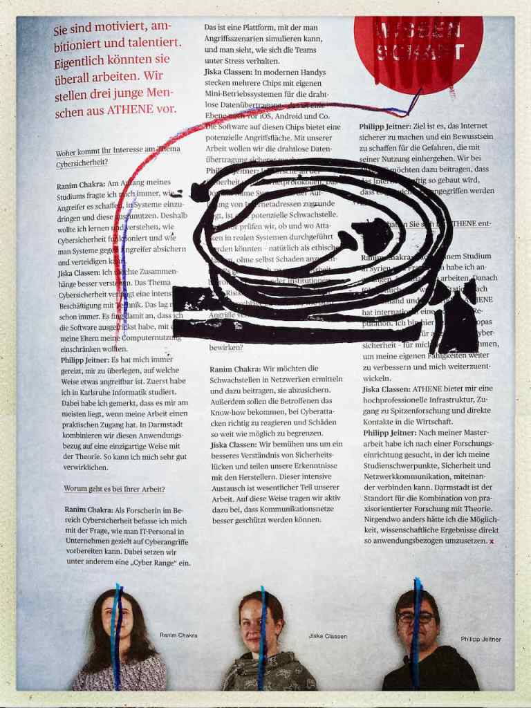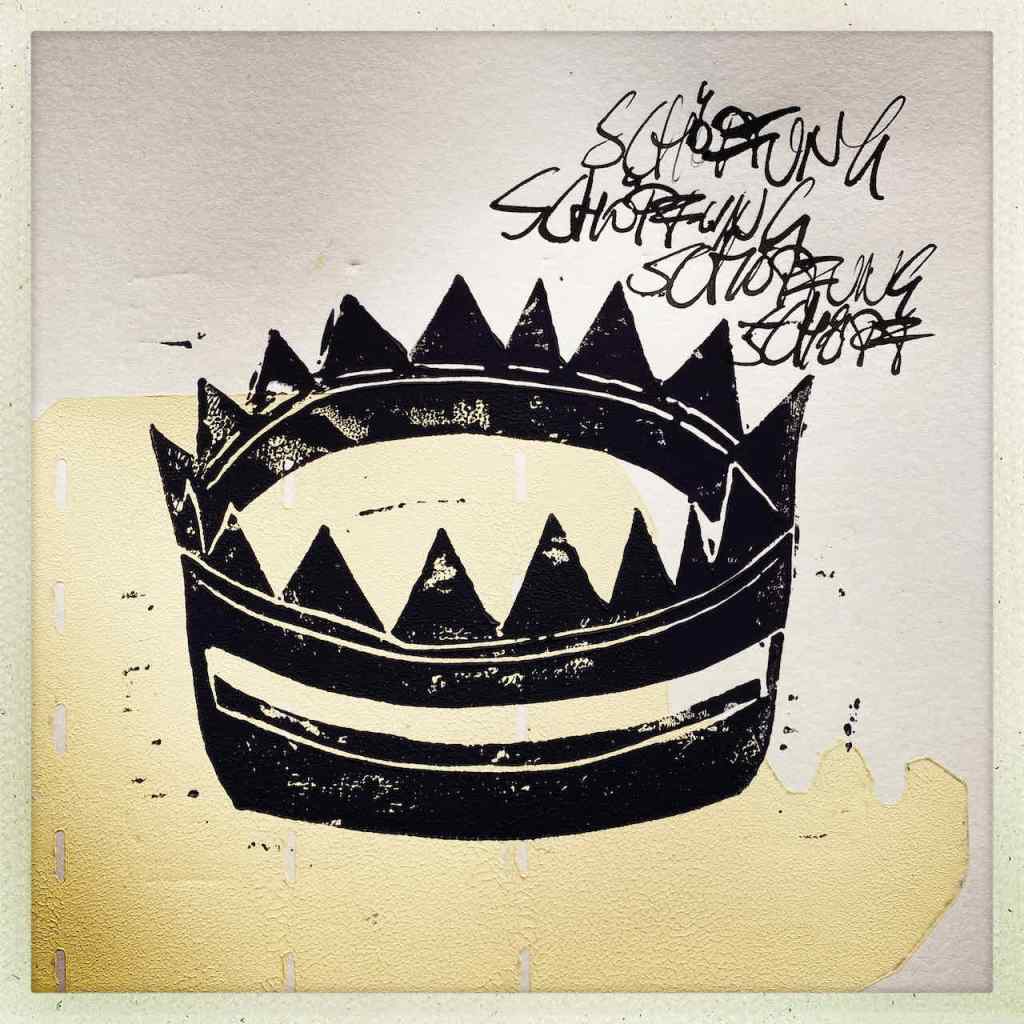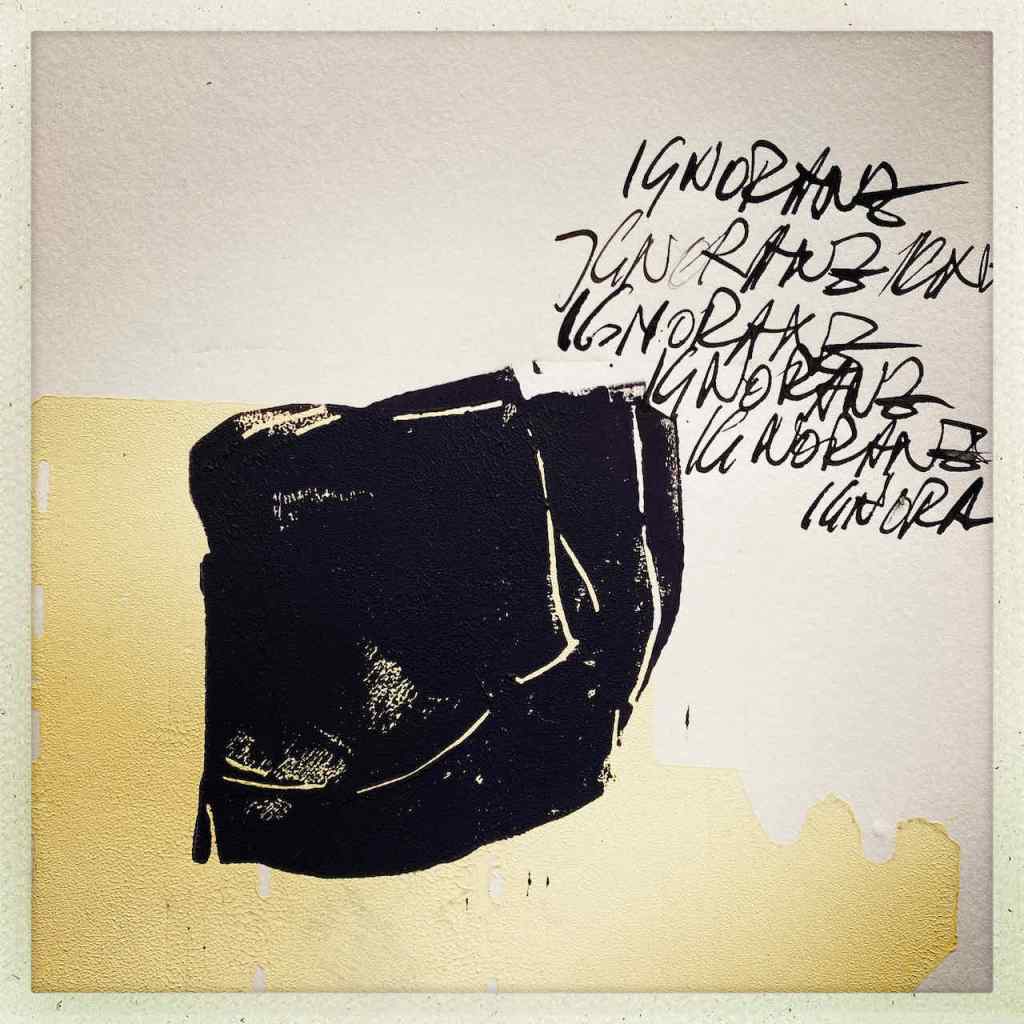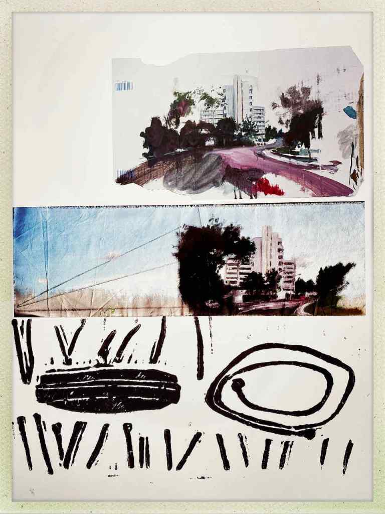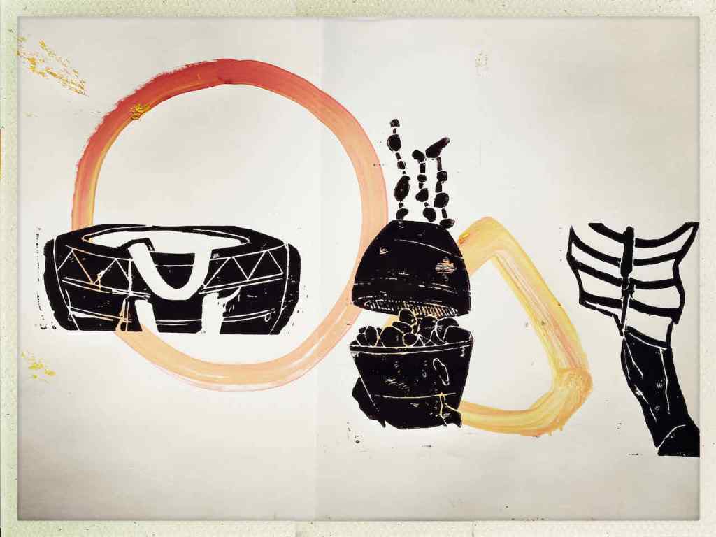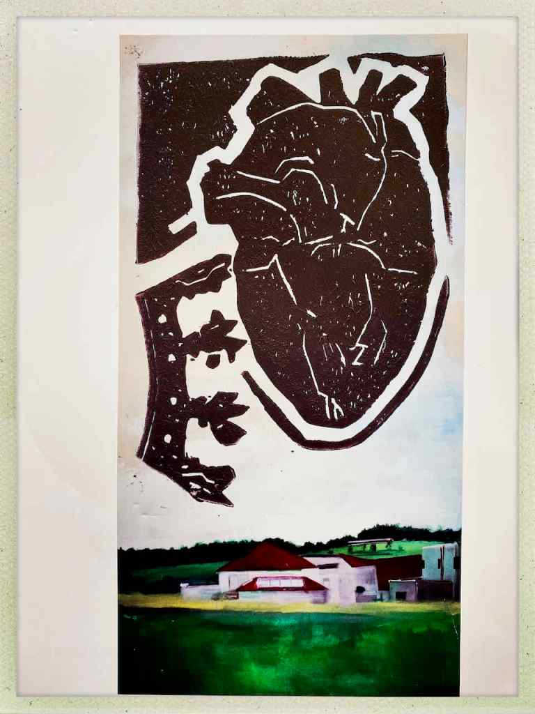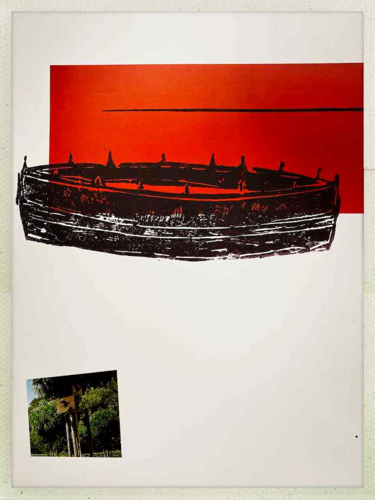 Gefunden hat er dann einen Ausstellungskatalog von Klaus Harth, Landtag Saarbrücken, Jahr 2011. Den hat er von ihm auf einer der Buchalovs Touren geschenkt bekommen. Und Den hat er zerschnitten, die Einzelblätter sortiert – was springt mich an und passt zu meinen Motiven – so irgendwie – und dann bedruckt, mit seinen Linolschnitten. Klaus Harth hat sein Einverständnis zur Veröffentlichung gegeben. Jürgen meinte zu mir, das Klaus ein feiner Kerl sei, guter Künstler und ein Freund von Collaborationen, genau wie er. Hier einige Überdruckungen: