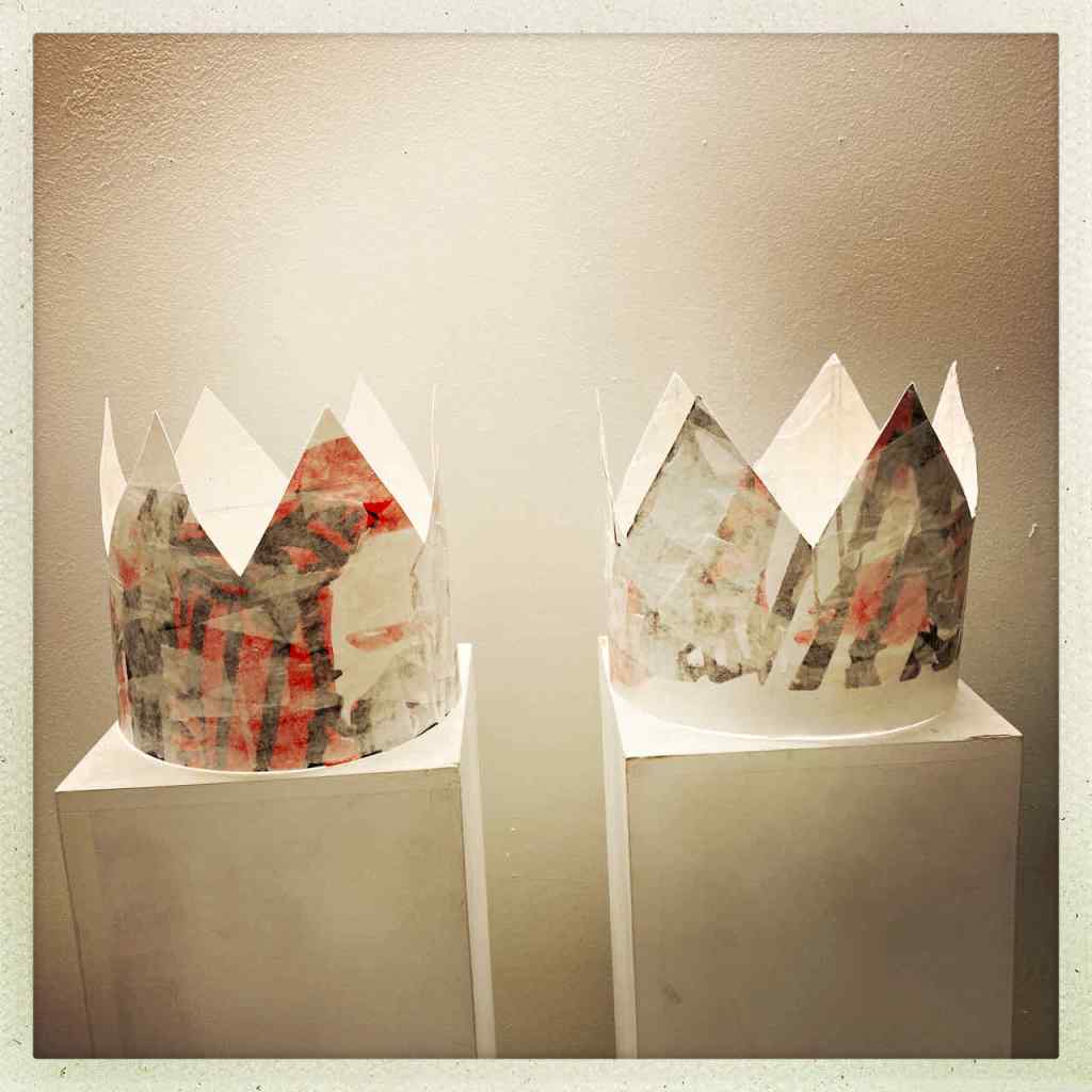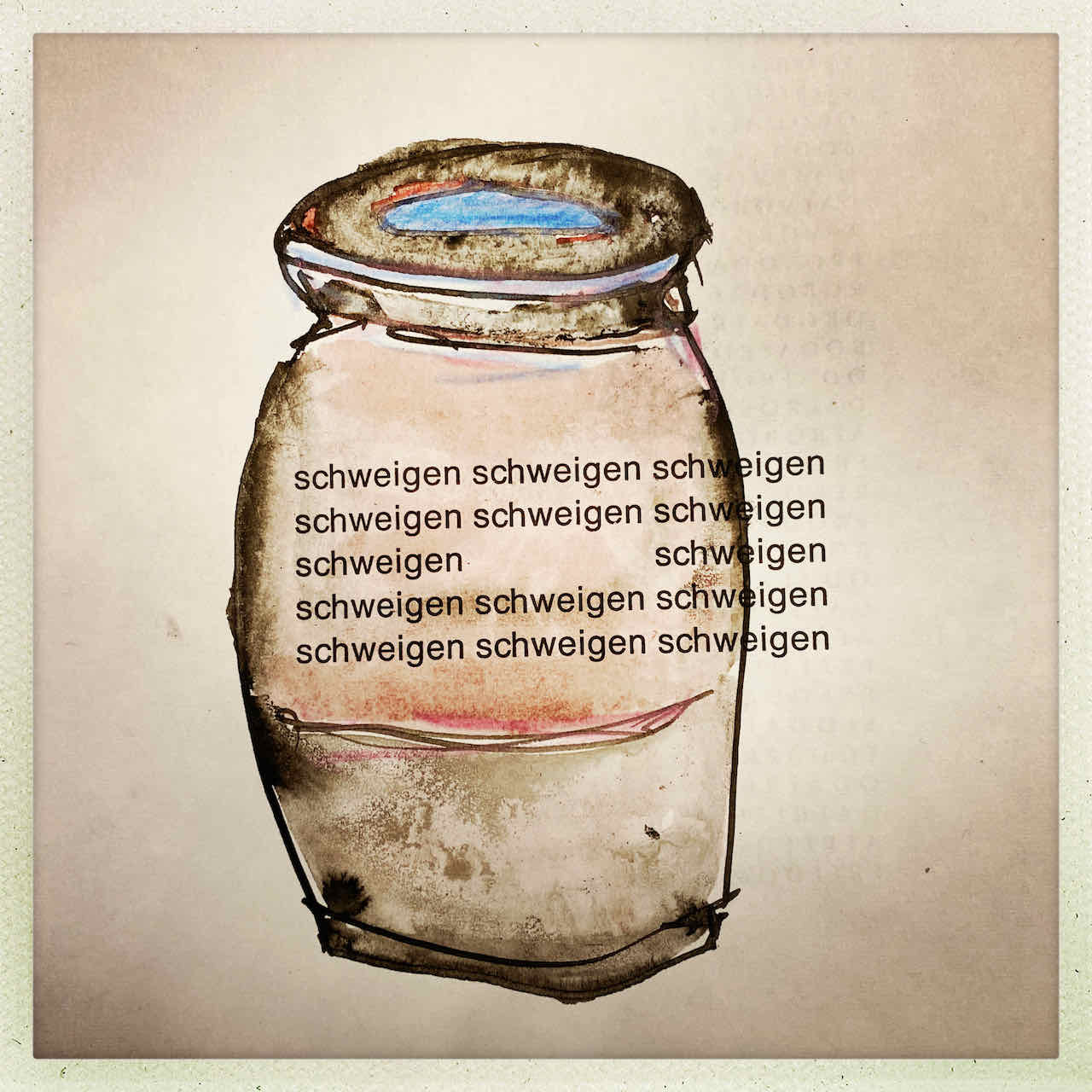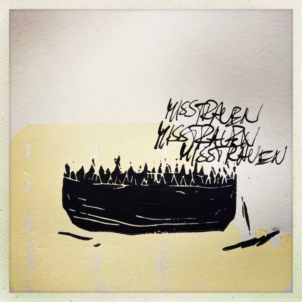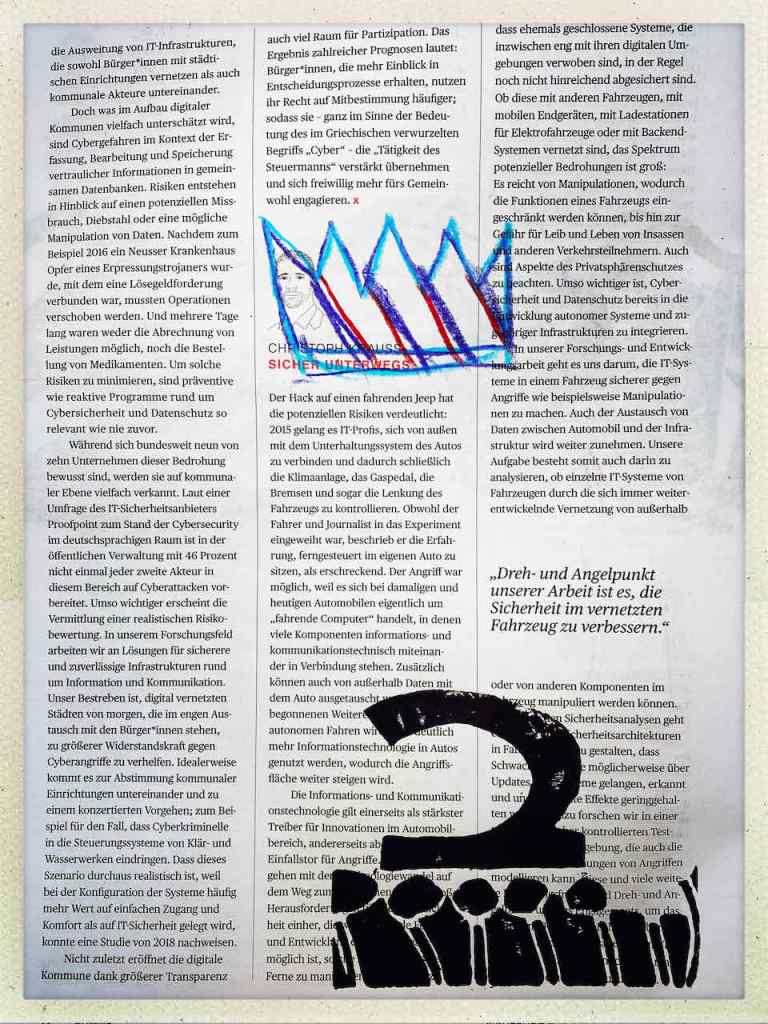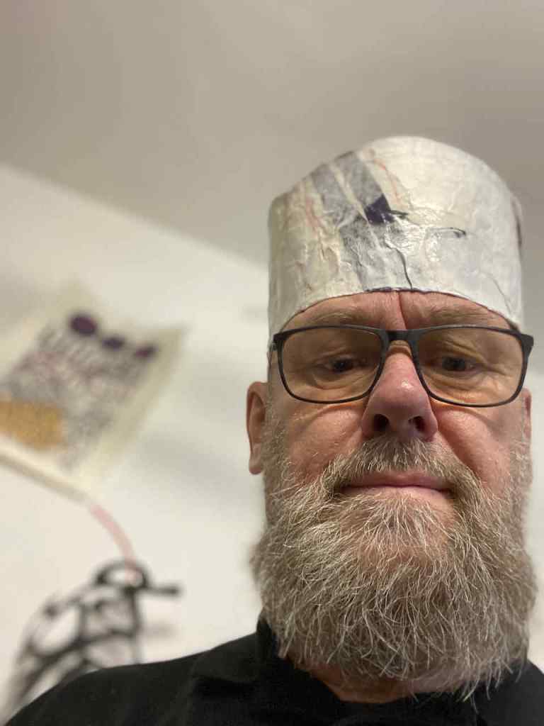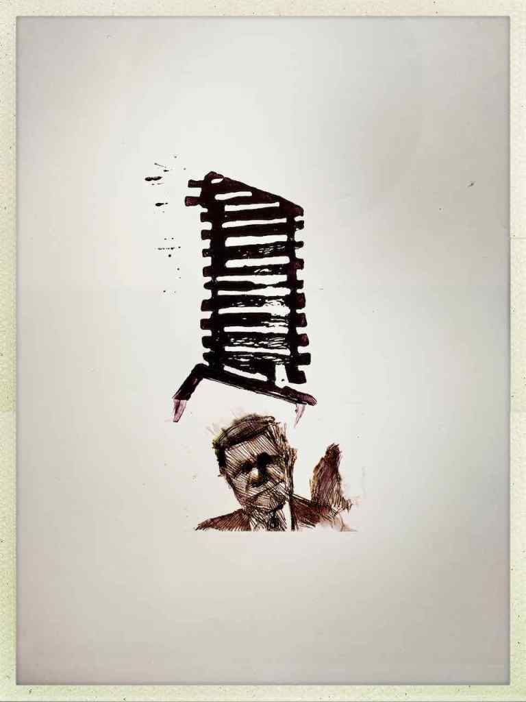 Gefunden hat er dann einen Ausstellungskatalog von Klaus Harth, Landtag Saarbrücken, Jahr 2011. Den hat er von ihm auf einer der Buchalovs Touren geschenkt bekommen. Und Den hat er zerschnitten, die Einzelblätter sortiert – was springt mich an und passt zu meinen Motiven – so irgendwie – und dann bedruckt, mit seinen Linolschnitten. Klaus Harth hat sein Einverständnis zur Veröffentlichung gegeben. Jürgen meinte zu mir, das Klaus ein feiner Kerl sei, guter Künstler und ein Freund von Collaborationen, genau wie er. Hier einige Überdruckungen: