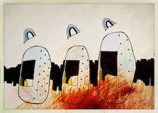 Dieses Motiv des Netzes ist nicht so einfach vom Himmel gefallen. Schon letztes Jahr hat Juergen mir hier in Montroig erste Tuscheskizzen gezeigt, die auf Fundstücken von kleinen Metallnetzen basierten. Bei vielen in letzter Zeit im Atelier entstandenen „OrtsMarken“ taucht es so massiv als Motiv auf, dass er sich ihm jetzt nicht mehr als eigenständigen Teil entziehen will. Und es gibt die Nähe zu seinem wichtigsten kreativen Baustein: dem Rhizom.Buchalov
