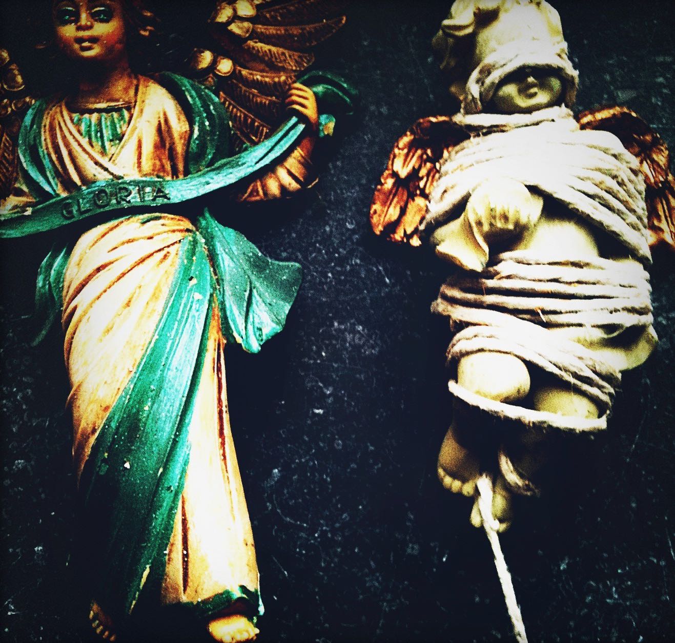 Kombination von Fluegelformen der Engel mit Raketen, geht das? Was für eine Wirkung erzeugt das? Wie passt das inhaltlich? Wenn ich ehrlich bin: es passt nicht, im Moment jedenfalls. Aber es irritiert. Und wer den Faden der Irritation weiterspinnt, kommt vielleicht inhaltlich zu einem Punkt, der dann durchaus Sinn macht.