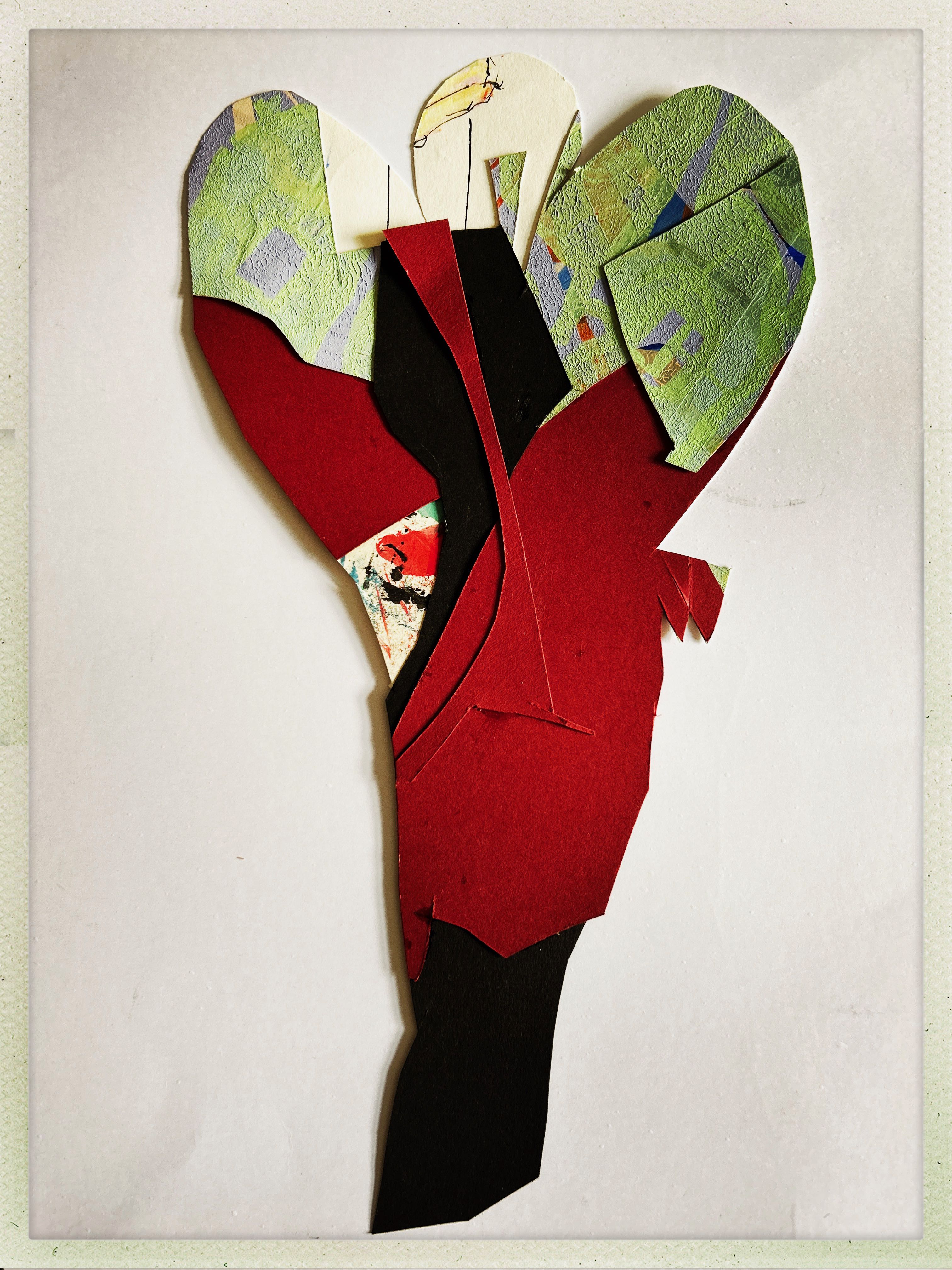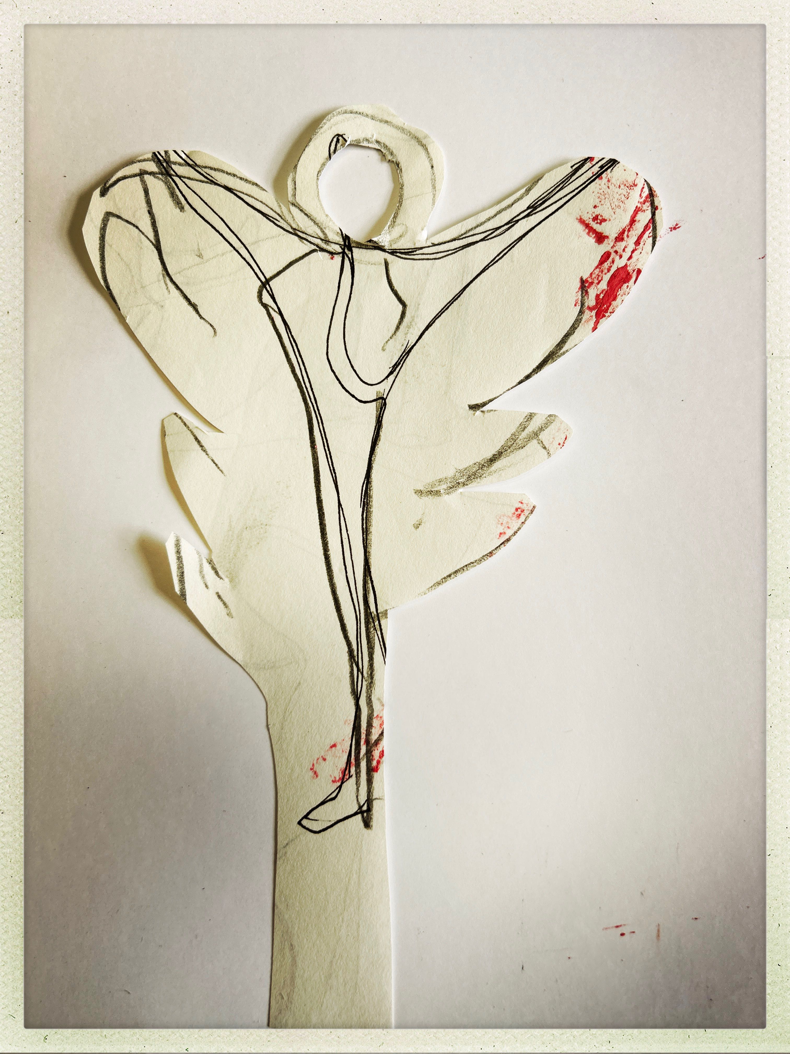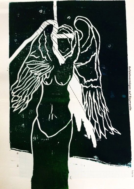 Das ist der Entwurf zu einem größeren Linolschnitt. Juergen nennt es die Engelsplatte, denn es geht um eine Sammlung von Engeln als Zeichen der Hoffnung in schwierigen Zeiten. Jürgen hat seinen Blog durchsucht und nach Engelsbildern geschaut, die 2012 und 2013 im Rahmen des Projektes „double bind“ entstanden sind, ergänzt um aktuelle Arbeiten.