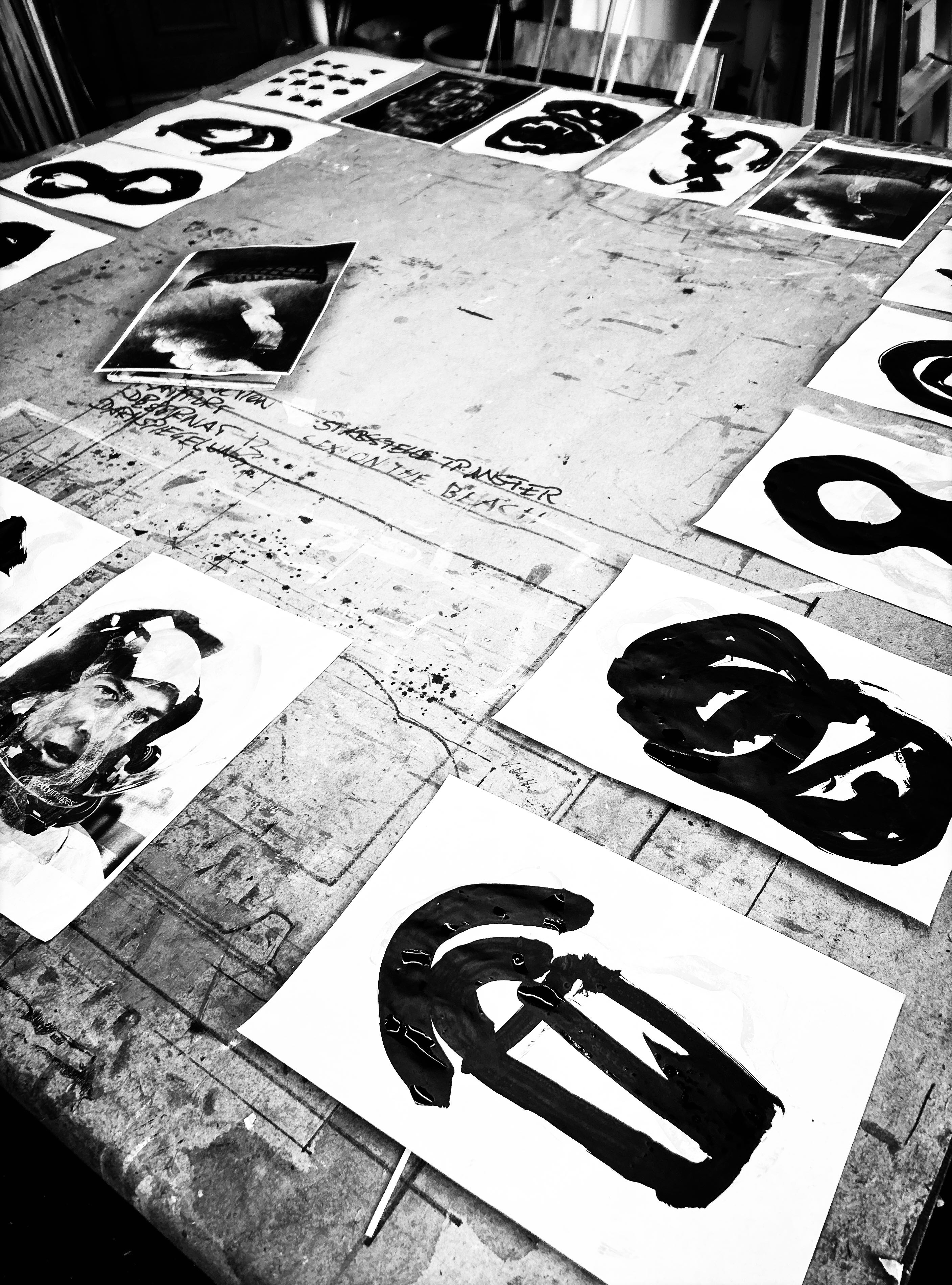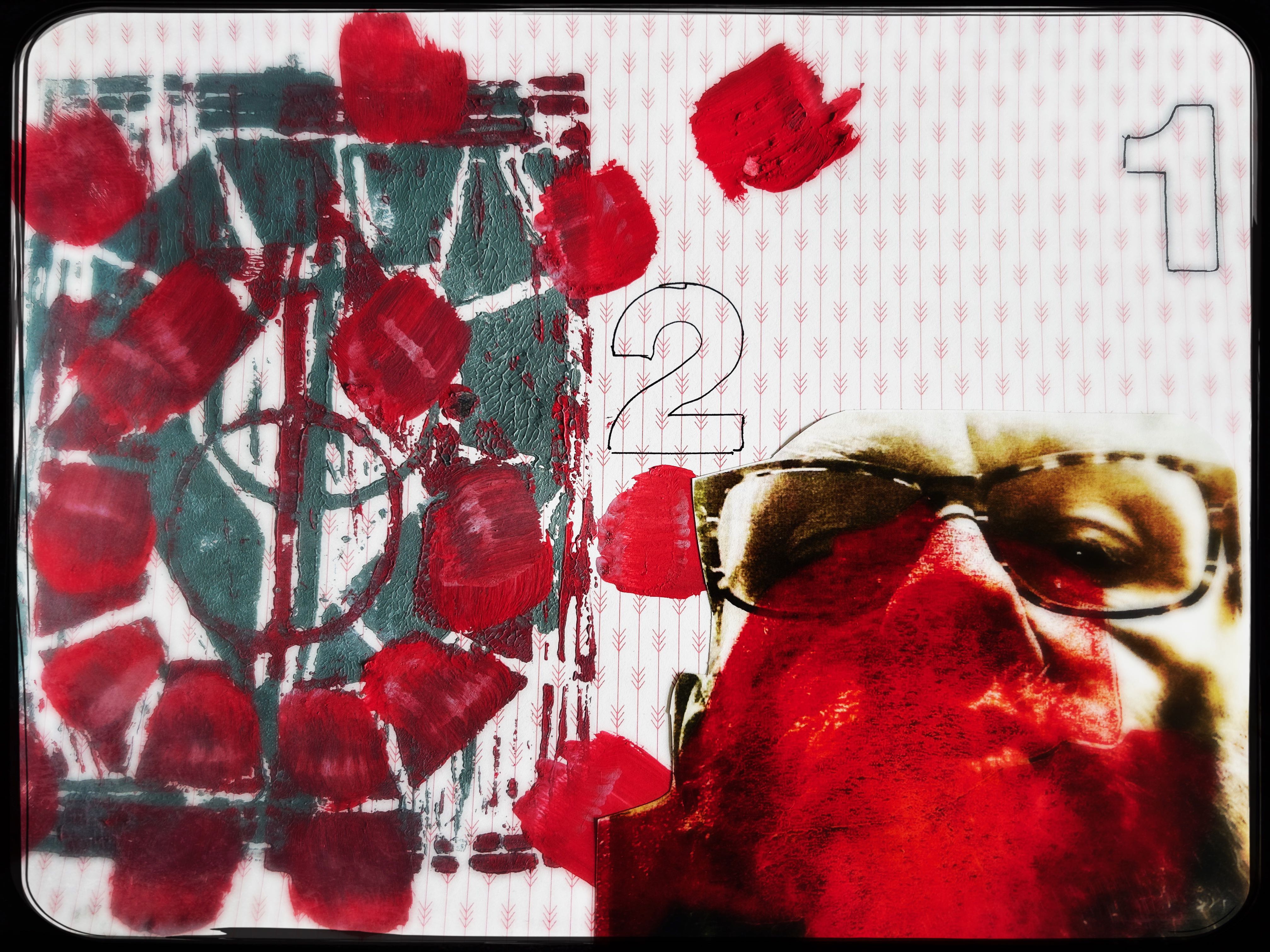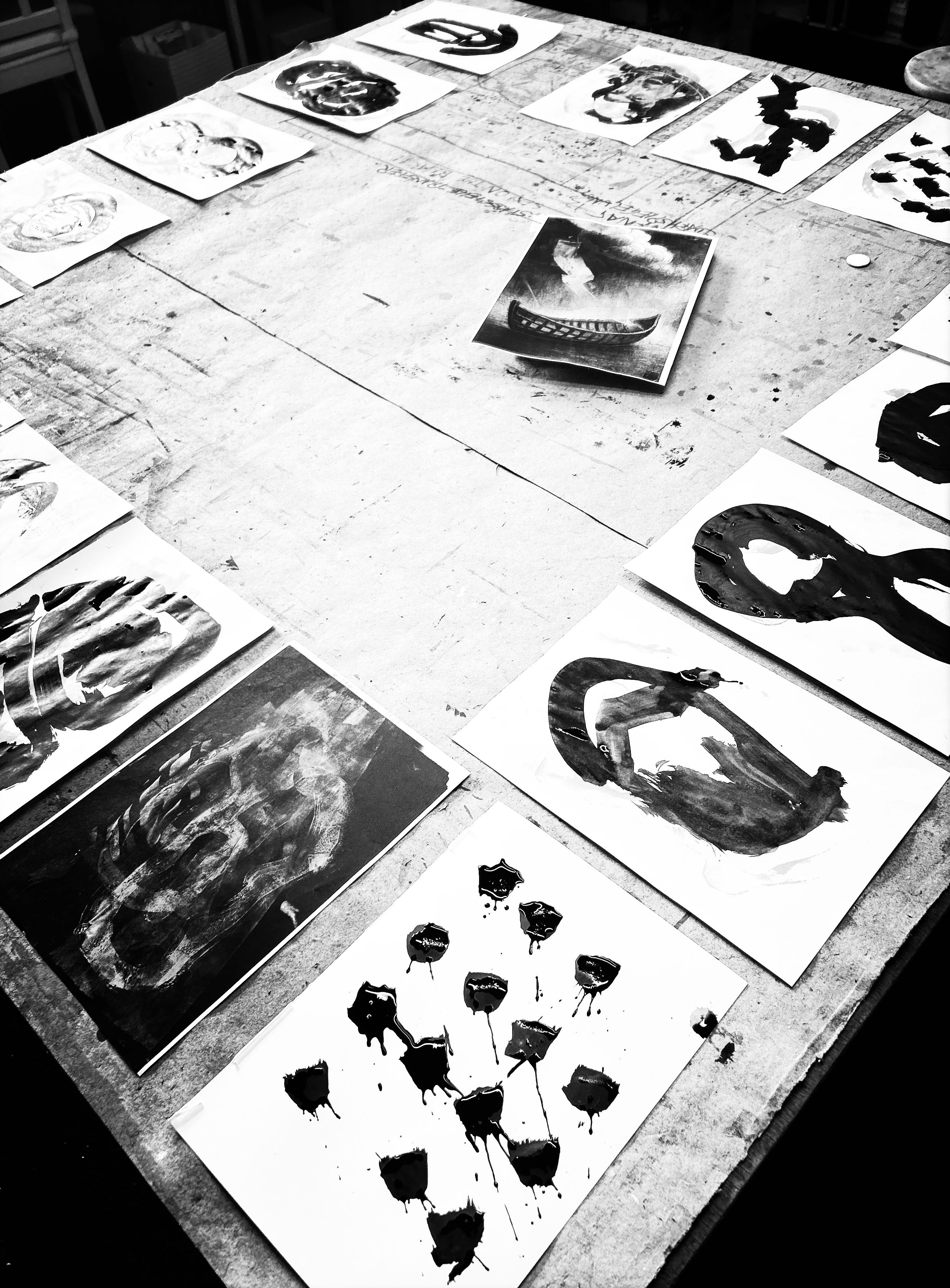Jürgen druckt fast immer nach dem Prinzip der verlorenen Platte. Und wenn dann der Druckvorgang beendet ist, noch etwas Farbe über geblieben ist, geht er zügig zu seinem Stapel von Resetpapieren, wählt einige Papiere fast schon zufällig aus und druckt die restliche Farbe mit der letzten Platte auf dieses Papiere. So auch in diesem Fall als es um das Thema „Zukunft“ ging.