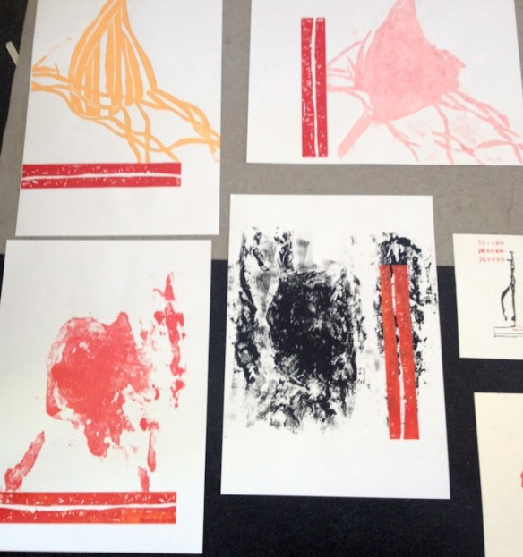 Er meinte weiter, ihm sei dabei aufgefallen, dass die Zwischenergebnisse des Druckprozesses, das Unfertige, das Flächige, das noch ohne Tiefe, dass dieses auf ihn eine große Anziehung ausübe. Und dass er sich beim nächsten Male wohl auf dieses Experiment einlassen werde, ausgehend von der Zeichnung, den Druckprozess irgendwann zwischendurch abzubrechen und das Zwischenergebnis als Endergebnis zu nehmen. Den Rest müsse der Betrachter machen. Ihm genüge der Reiz des Zwischenergebnisses, das Unfertige.
