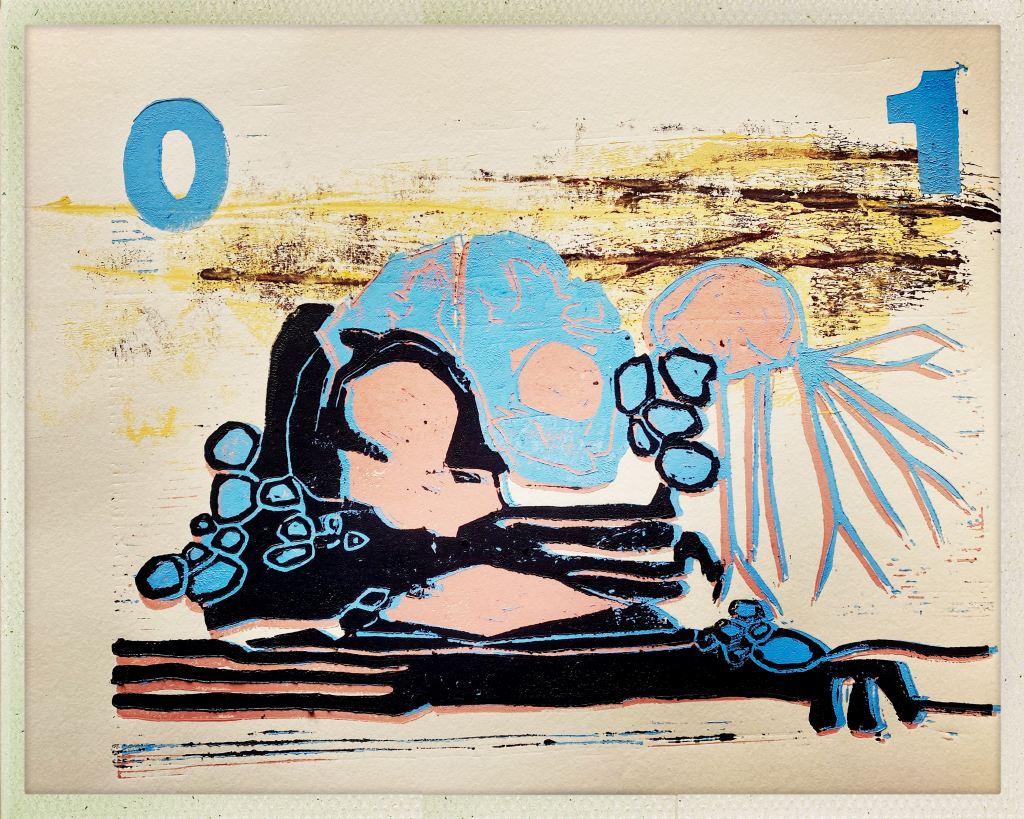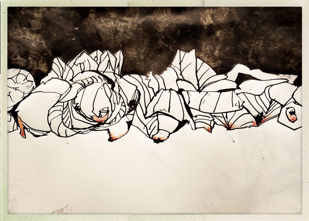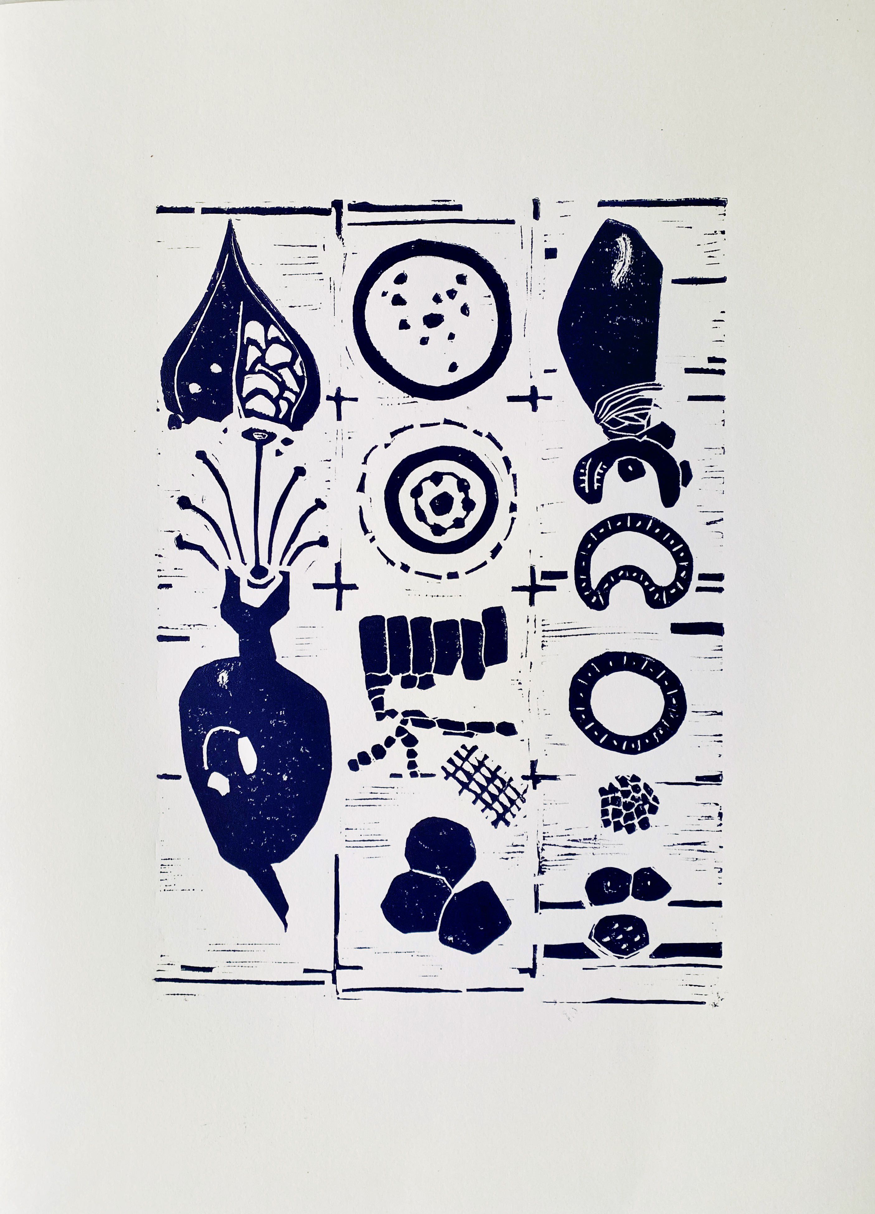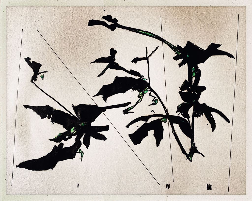 aus der skizzenhaften Visualisierung eines Vortrages durch Antje wird nun ein Linolschnitt: die Skizzen, die Antje kritzelte, hat Jürgen gesehen – die Worte zum pflanzlichen Wachstum hat er gehört – Verständnisfragen hat er gestellt – aber wirklich begriffen und verstanden hat er nur wenig. Geblieben sind Skizzen, die nun zu einem Linolschnitt wurden.