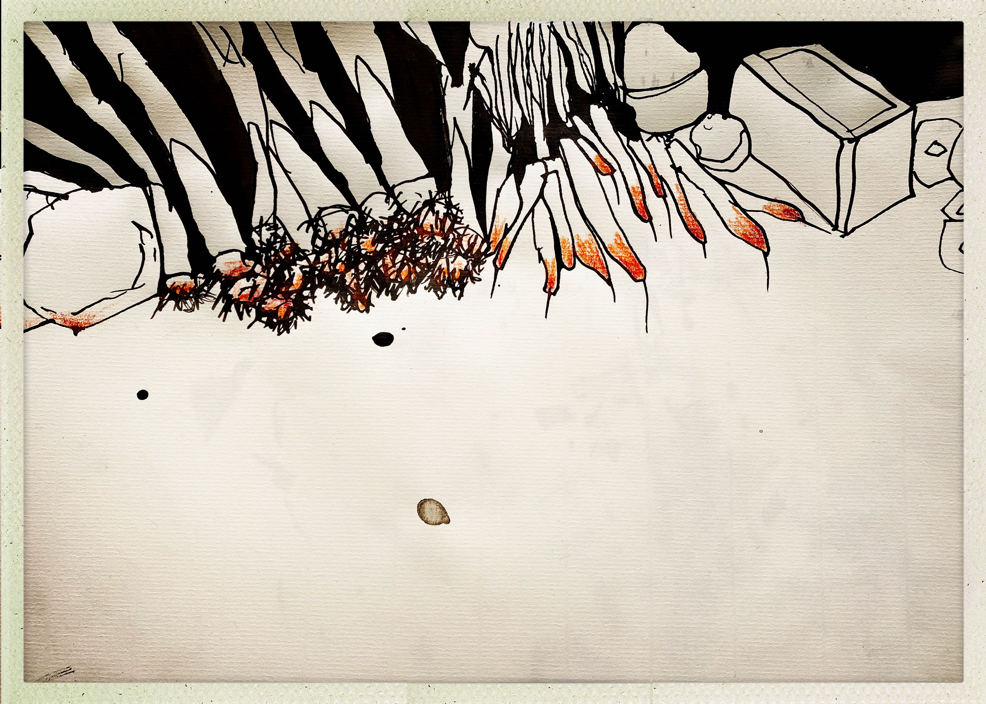 Und dies sind zwei der Zeichnungen, die im ersten, spontanen Nachklang entstanden sind (weitere Arbeiten werden folgen):