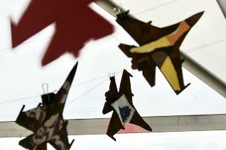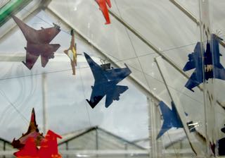 “Himmel und Erde sind eins, besser: sie gehören zusammen. Der Löwe hat mit seinem Foto den Blick auf den Boden gelenkt. Boden kann ja vieles sein, bis hin zur Fläche eines Tisches. Mit Böden verbindet sich auch immer die Frage nach der Beschaffenheit ihrer Oberfläche. Und dem Material, das sie ausmacht. Ein Boden ist flach. Und alles, was sich von ihm abhebt ist erhaben. Aber wichtiger war mir das Gegenstück: der Himmel. Denn der Himmel ist das Oben, die Hoffnung, die Zukunft – auch wenn diese fürchterlichen Kriegsgeräte im Foto ihn in Realiter als Bewegungsraum mit dem Ziel der Tötung benutzen. Der Himmel macht uns die Dinge leicht und erträglich. Auch den Tod. Zur Symbolik fotografischer Objekte schreibe ich jetzt mal nichts. ( Das Foto ist im “Gewächshaus für Kunst” in Straelen entstanden).”