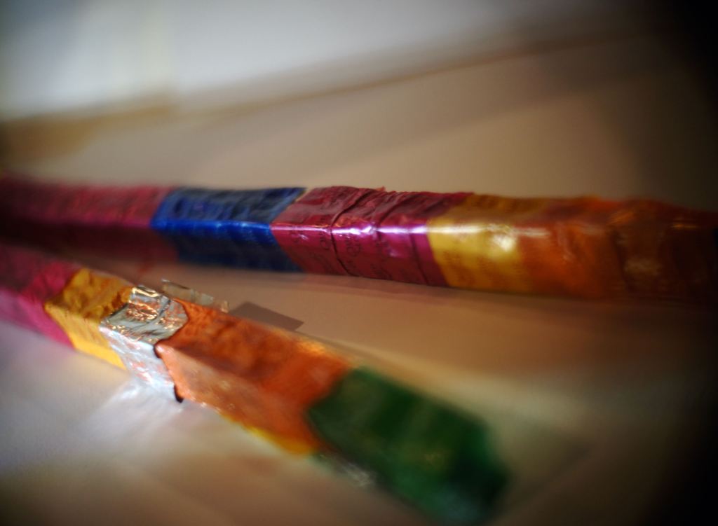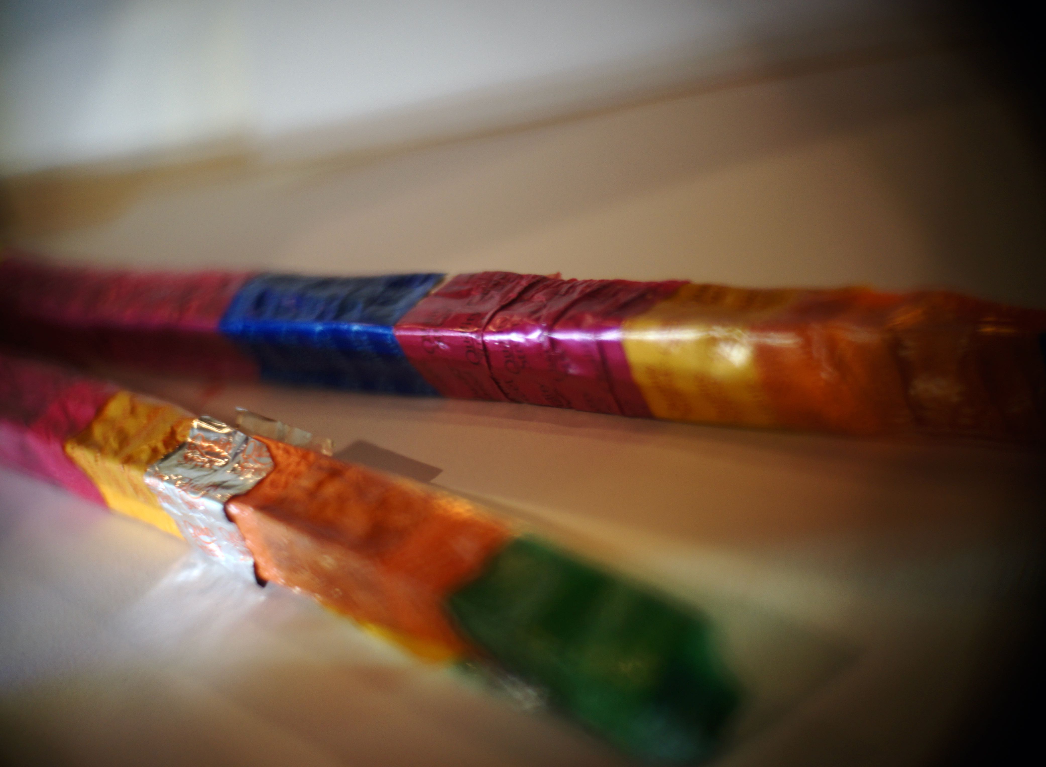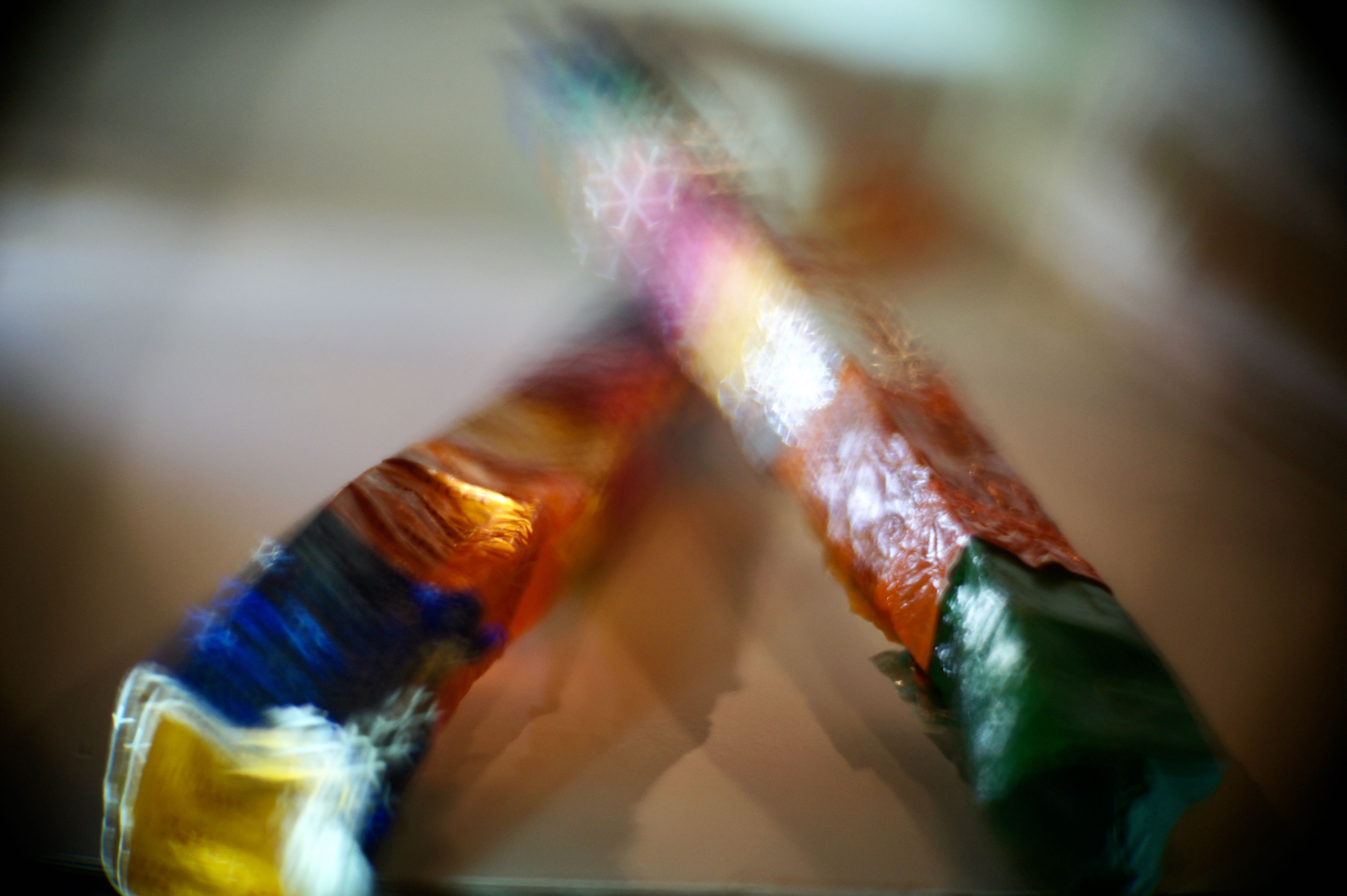 Drei farbige Stäbe, die für eine positive Sicht auf das Leben stehen. Es sind besondere Objekte, erzeugt aus Bonbonpapier und dem Bewusstsein, das aufgeben keine Option ist. Es sind Experimente, und ihre Präsentation arbeitet mit Schaerfe/ Unschärfe und einem Altglasobjektiv, das der Löwe speziell für Jürgen gebaut hat. Dank!