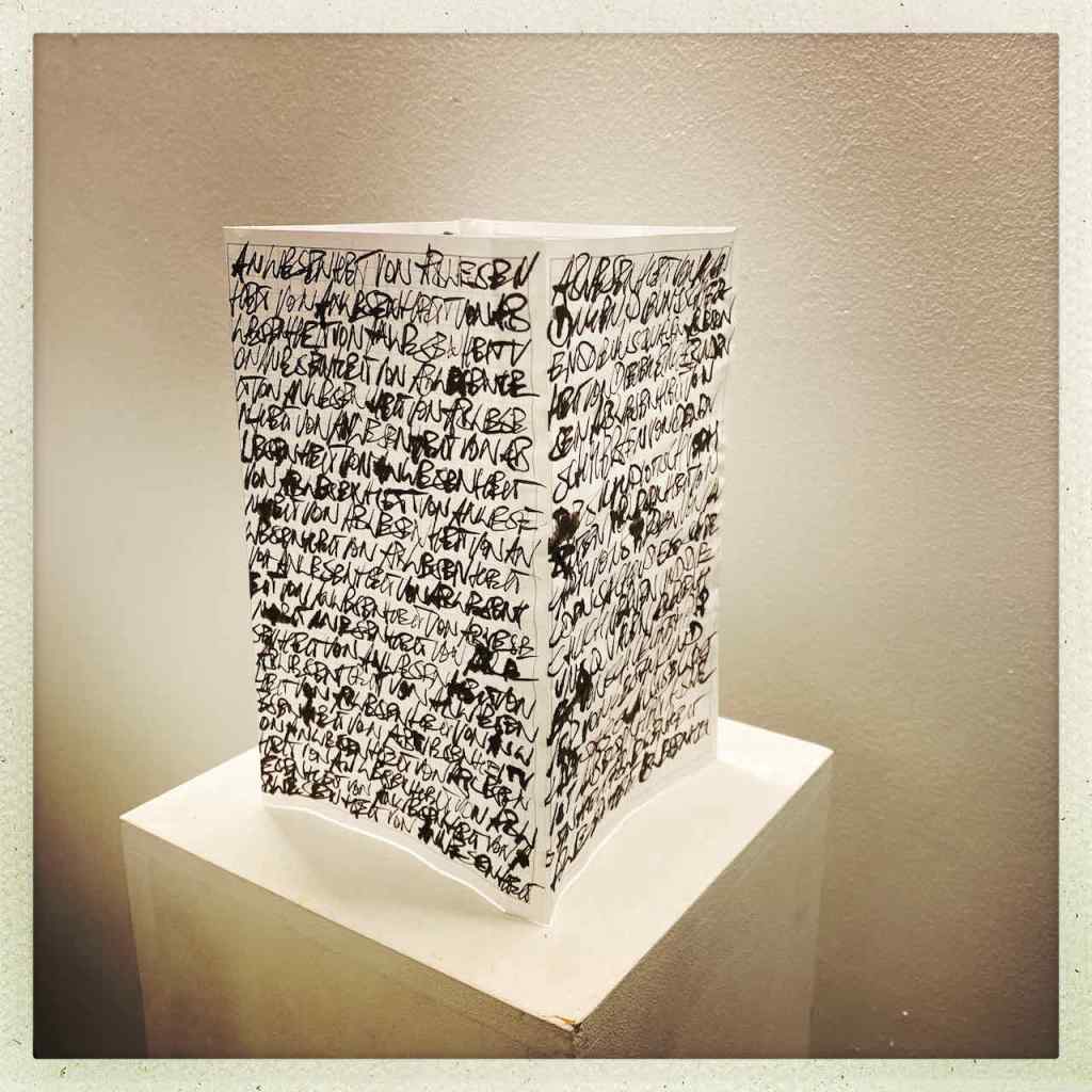 Diese drei Begriffspaare „Natur, Zeit und Ganzheitlichkeit“ seien ihm bei einem grafischen Schreibversuch zu Eden3 letzte Woche vor die Füsse gefallen. Mittlerweile könne er sie auch inhaltlich genauer fassen und konkretisieren. Dazu später mehr. Heute hat er dann die Seiten seiner Schreiberei zu einem Objekt zusammengefügt.