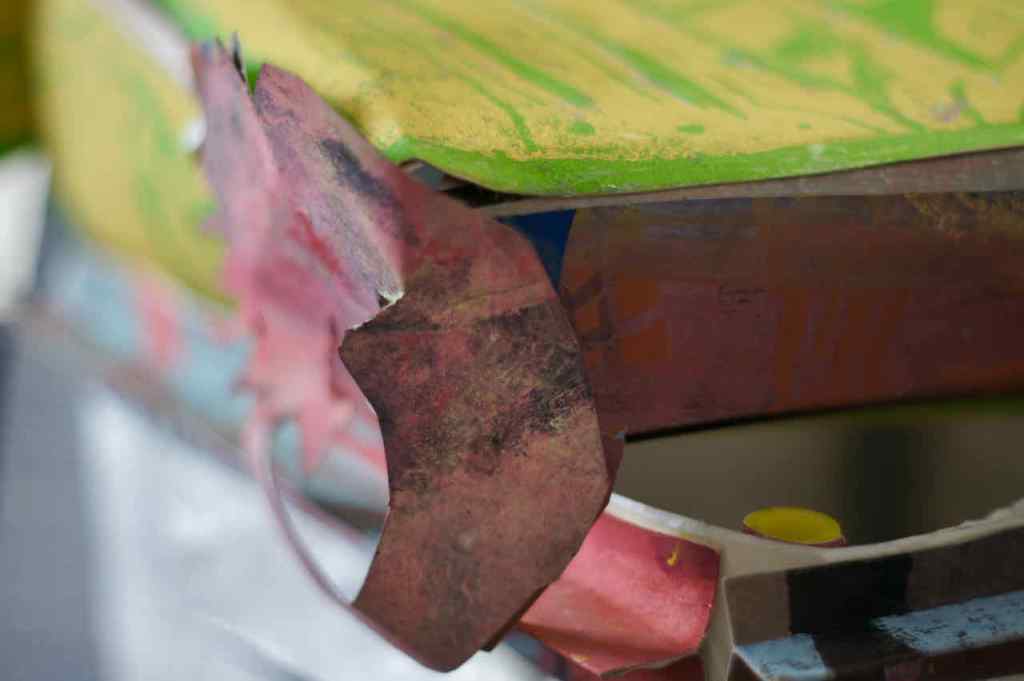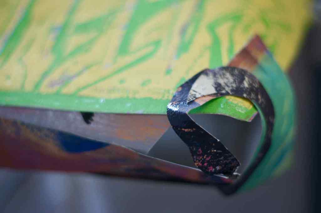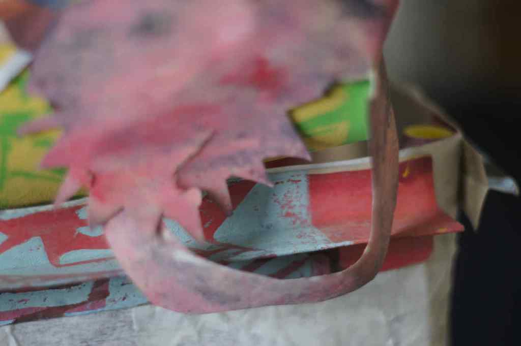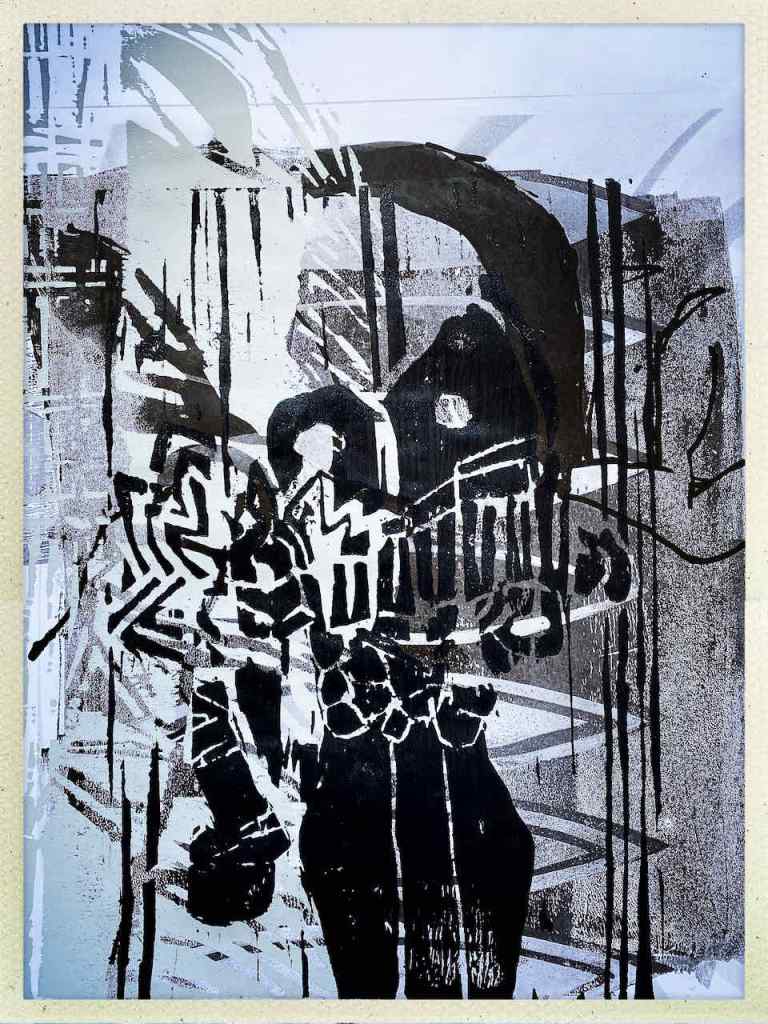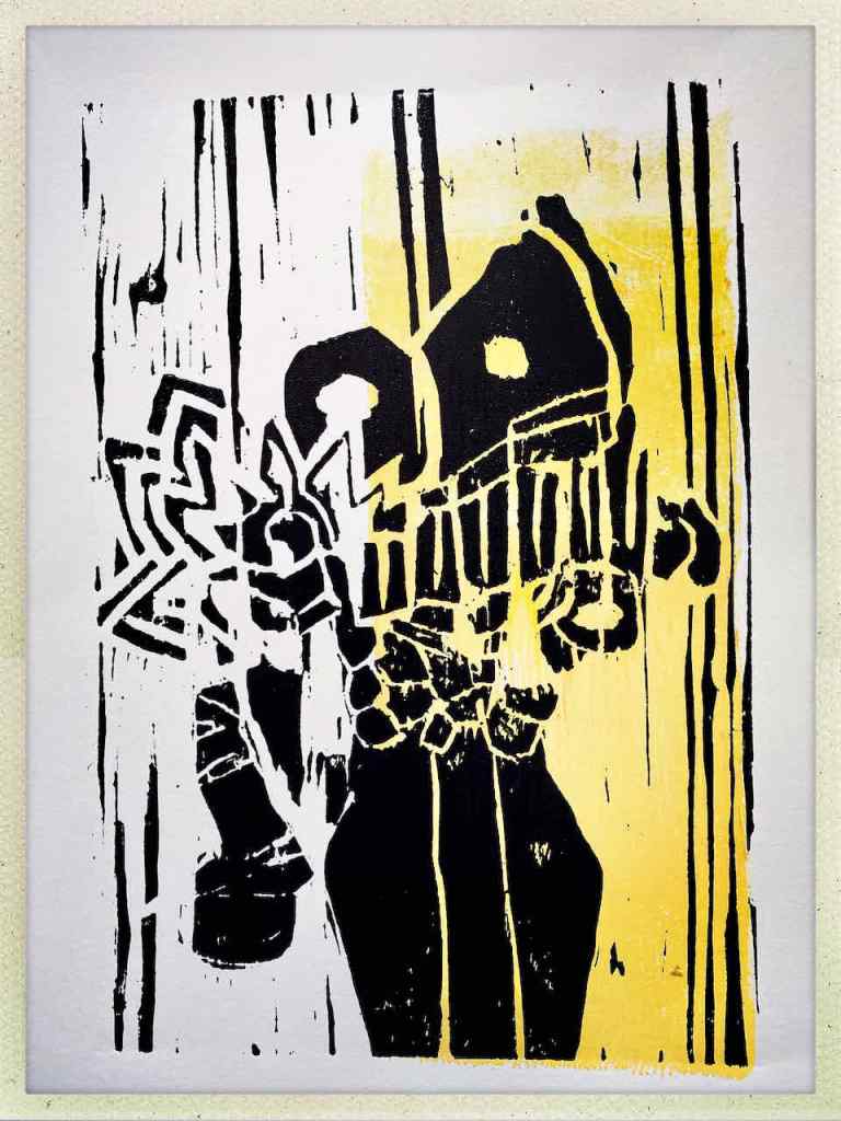 Entstanden ist nun, schnell – schnell – schnell, ein Holzschnitt nach dem Prinzip der verlorenen Platte mit dem Titel „schauen, wundern, schlucken“. Dieser Titel fasziniert ihn, und er scheint sich für mehr zu eignen. So sagte er jedenfalls. Ich bin gespannt, ob daraus eine Themenblock wird.