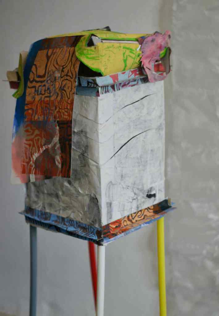 Und die Zeitmaschine als Quader aus Papier und Pappe, gewachsen ohne Plan, einfach so aus Resten zusammengeklebt und fotografiert mit Jürgens neuem Spielzeug, der Altglaskamera: