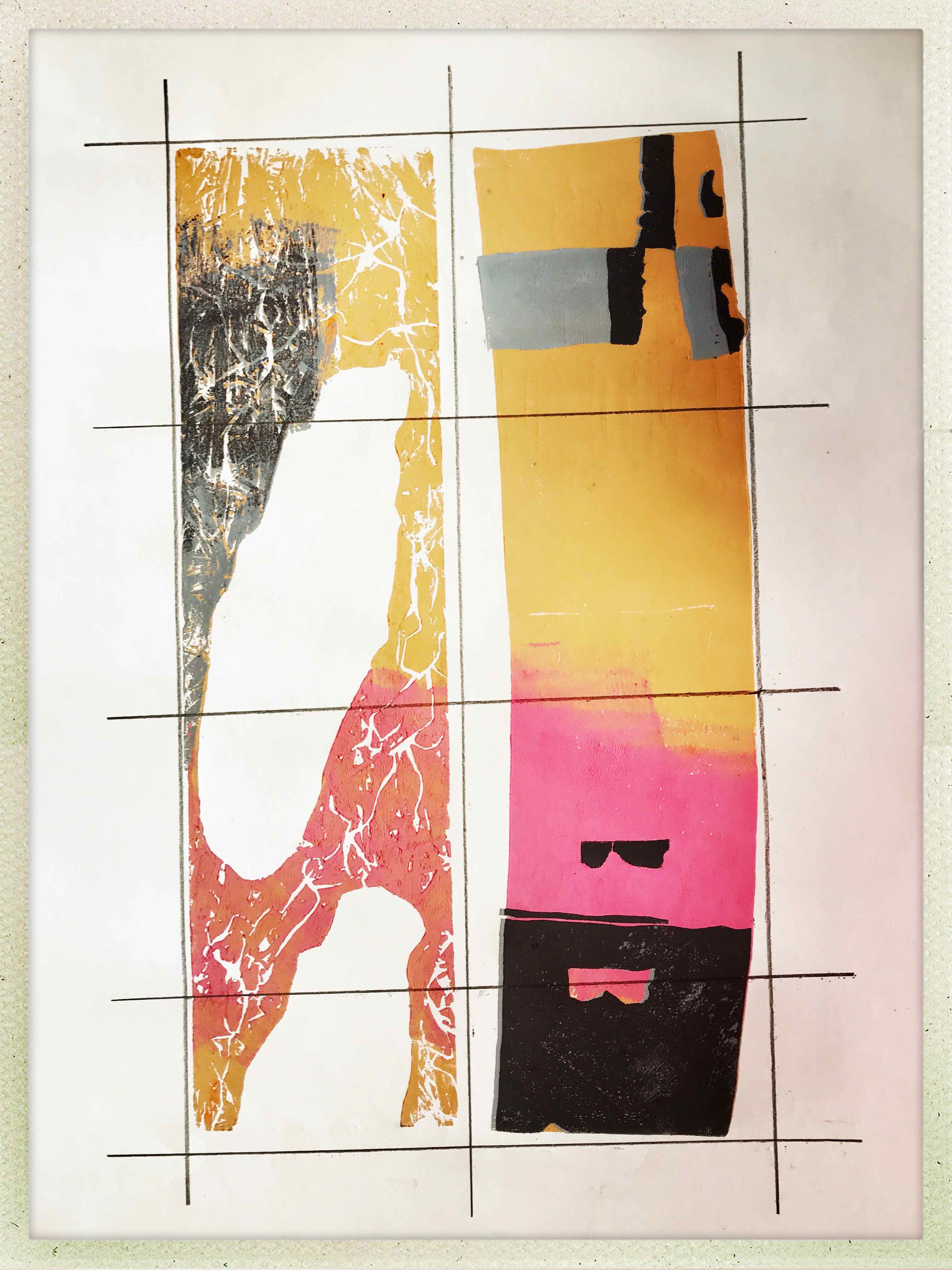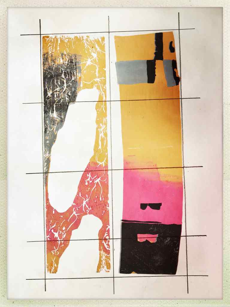 Na ja, es hat gedauert, keine Frage. Mit Unterbrechungen hat Jürgen das obige Bild gedruckt, Wochen hat es gedauert und ich meine, dass man es ihm ansieht. So richtig dynamisch schaut es mich nämlich nicht an. Die Unterbrechungen im Arbeitsprozess waren auch Unterbrechungen in der Energie, die hineingeflossen ist. Aber dekorativ sei es, meinte Jürgen. Aus seinem Mund ist das nicht unbedingt ein Kompliment.