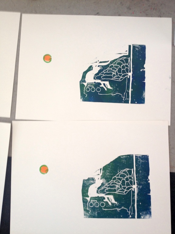 Als ich bei Ihnen vorbeikam, ich hatte nicht damit gerechnet, sie am Sonntag im Atelier „Zelle k4“ anzutreffen, waren Rudolf der Bildhauer und Juergen dabei, mit Tusche und Stempeln und einem hingehuschten Druckstock „einfach nur so“ – wie sie es nannten – zu arbeiten. Sie wirkten ungemein befreit, wie spielende Kinder, und meinten, dass dies sehr lustvoll sei. Sie druckten ohne genauen Plan – so „einfach vor sich hin“. Gemeinsam. Am Dienstag wollten sie dann ernsthaft prüfen, was von all den Werken den Weg in die Veröffentlichung finden kann.