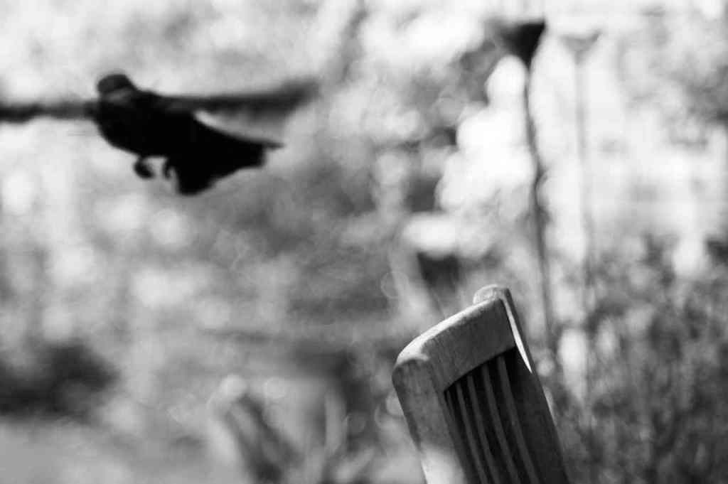 Der Anflugplatz ist die Stuhllehne des Gartenstuhls auf der Terrasse, das Nest der Amsel sitzt direkt links neben der Terassentür im Efeu, und sie huscht „husch husch husch“ ab ins Nest. (Altglasfotografie)