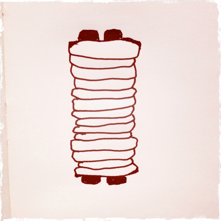 Also zurück aufs Minimum: ein schwarzer Fineliner und das Moleskinbuch. Und jetzt zeichne er täglich nach dem Frühstück, was so assoziativ anliege und hoffe auf einen Weg. Die Ergebnisse fotografiere er mit dem iPhone und der App „Hipstamatic“. Vielleicht zeige er ein paar der Ergebnisse in der Größe DIN A 0 übernächstes Wochenende bei seiner Atelierausstellung. Mal schauen.