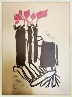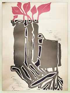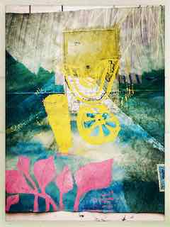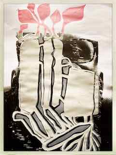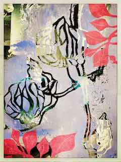 Da ist wohl ein neues Thema am Horizont aufgetaucht: „Keimling | Sprossung | Wachstum | Rhizom | Verlängerung durch Wachstum“. Im Atelier lagen zwei kleine unbearbeitete Linolschnittplatten herum. Daraus ist in Kombination mit Restepapieren oder Papieren, die ihm seine Kunstfreundin Antje überlassen hat, u.a. das hier geworden: