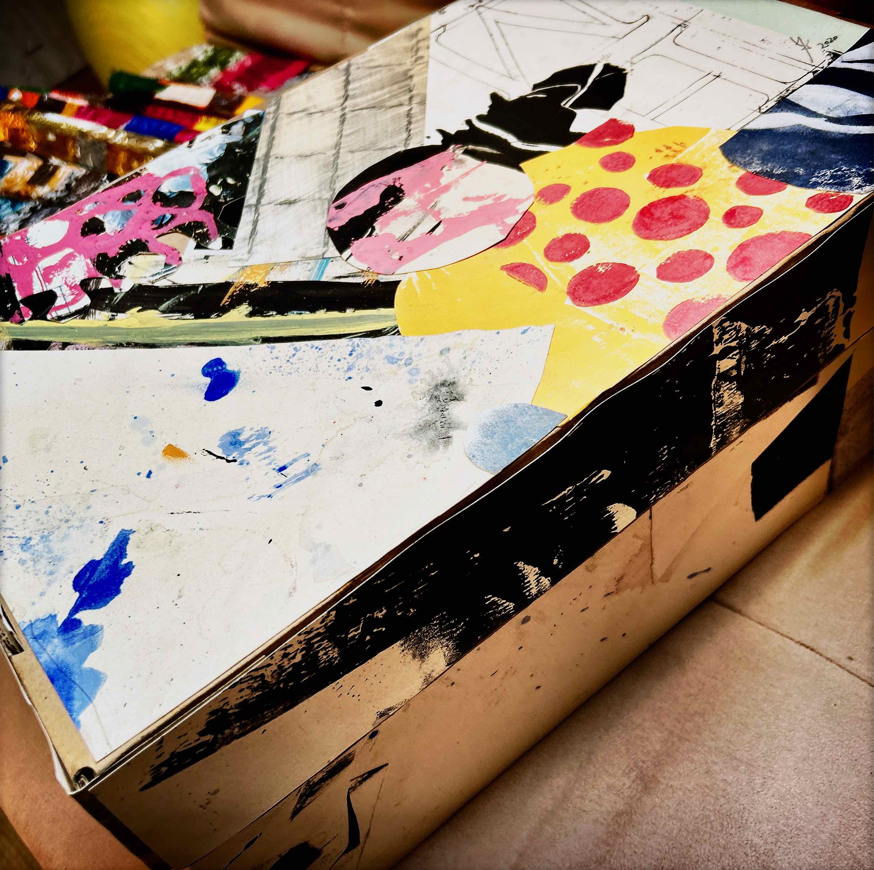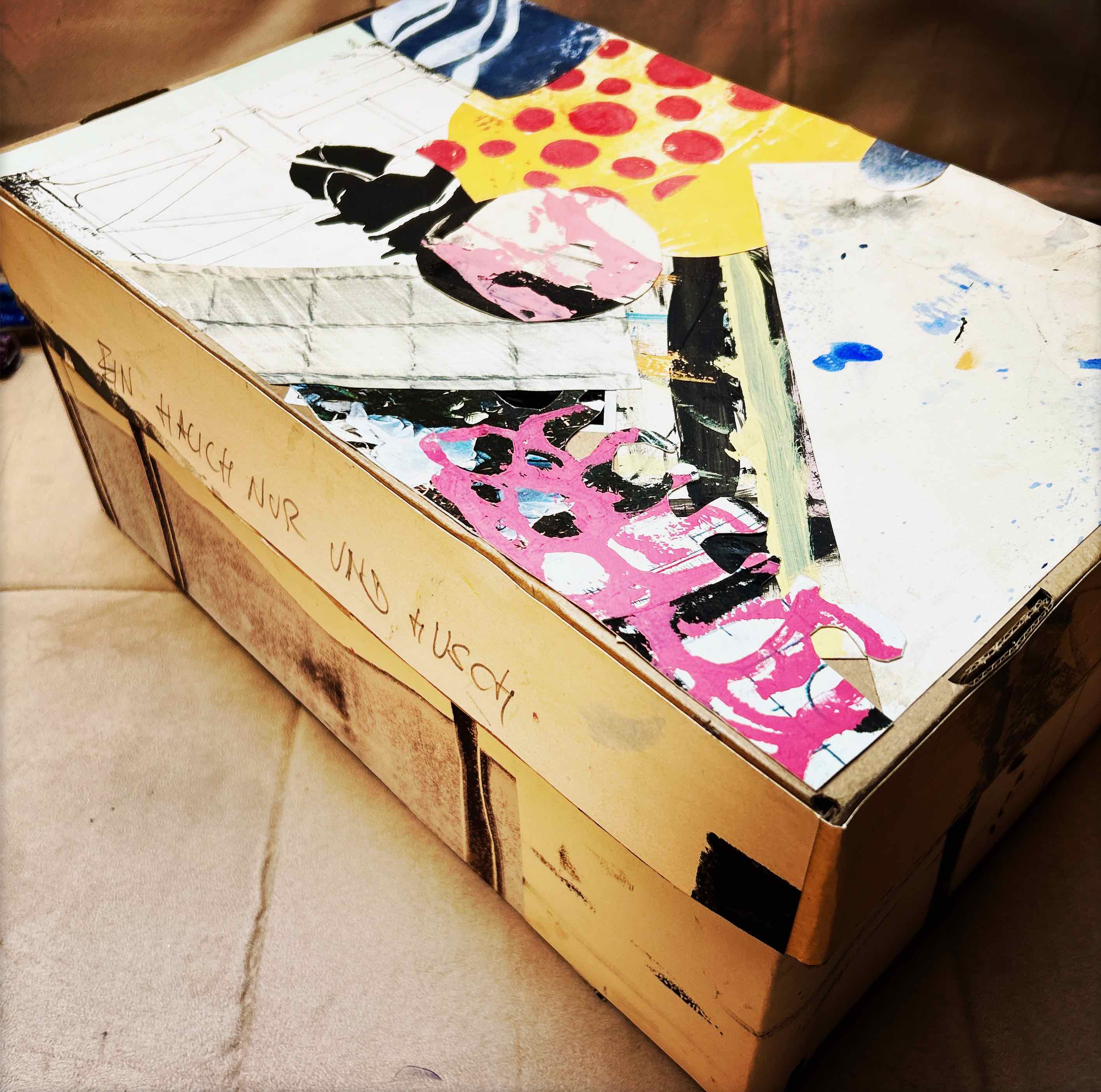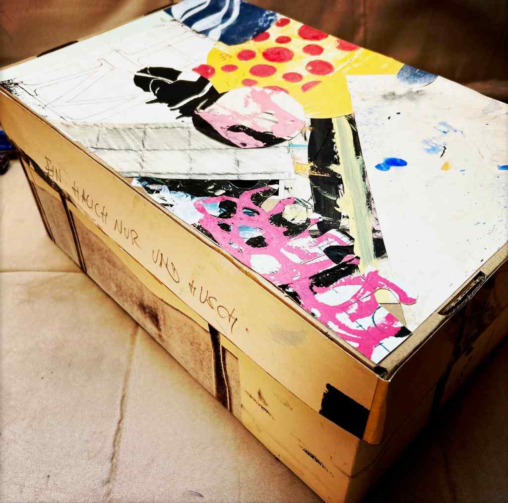 Und für die eigenen Karten/Werke benötigt man dann natürlich ein eigenes Archiv. Jürgen nennt das seine Buchalovs – Mail-Art – Box. Das ist es auch, erst einmal, jetzt am Anfang: ein großer, selbst gestalteter Pappkarton, in den die eigenen Exemplare wandern.