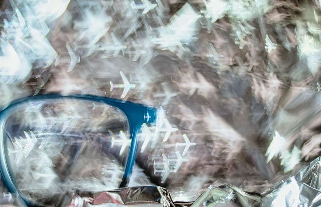 Des Löwen’s Überlegungen: “ …die Brille ist das verbindende Element … denn der Löwe braucht auch so ein Fahrradgestell auf der Nase … Kurzsichtig und Altersweitsichtigkeit … also vollblind … da dem Löwen manchmal der Schalk im Nacken sitzt, hat er die Flugzeugaufsteckblende genommen … dann noch Aluminiumfolie zerknüllt … und Taschenlampenlicht für die Spitzenlichter … all das kennt man schon beim Löwen … dreimal Klick … eines für die Tonne … und schon hat mat ein wunderbares Weitblickbrillenmotiv … denn Flugzeuge bedeuten Ferne beim Löwen …“ Das Bildmotto lautet daher: „Des Löwen Weitblickbrille“.