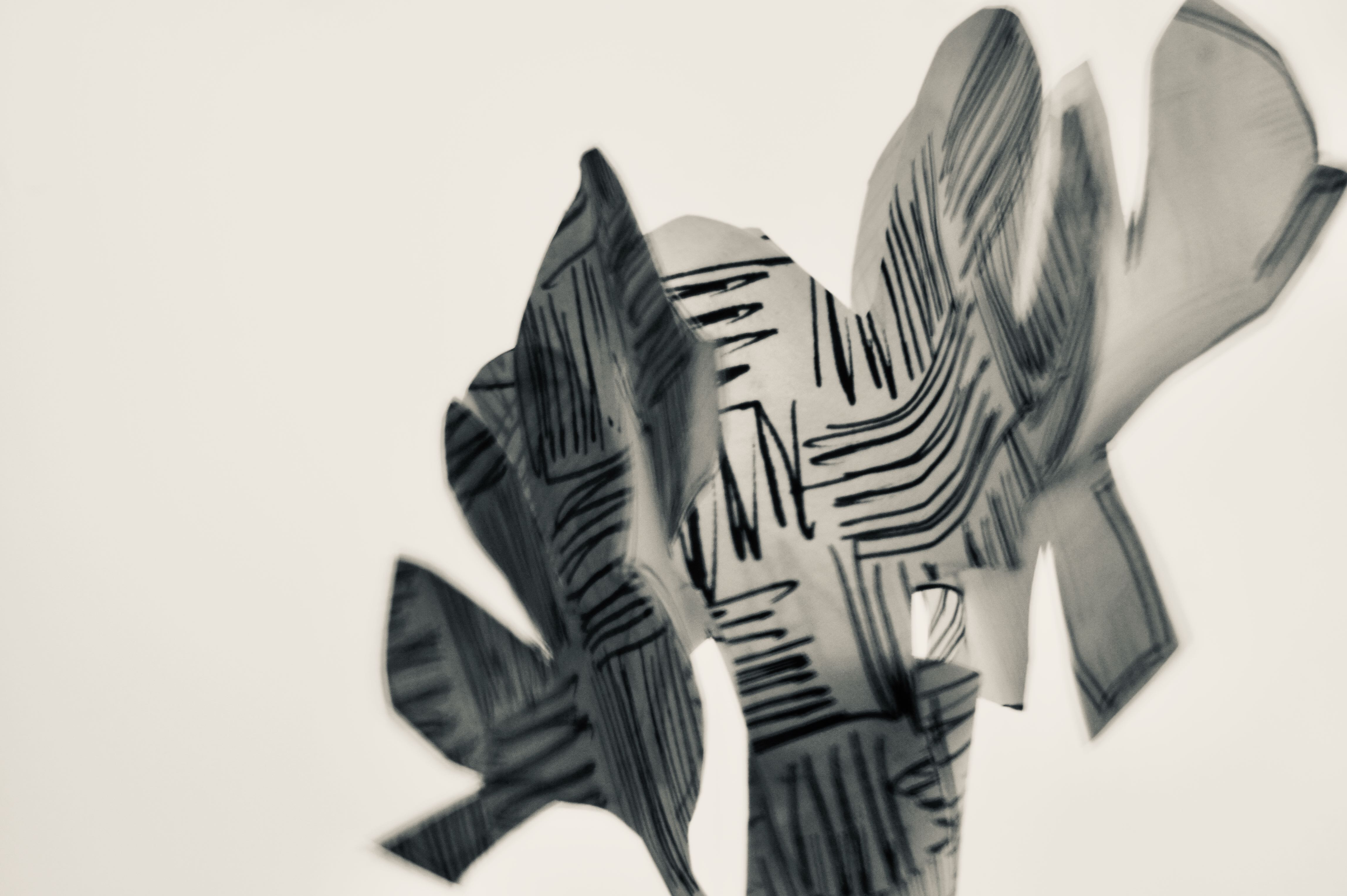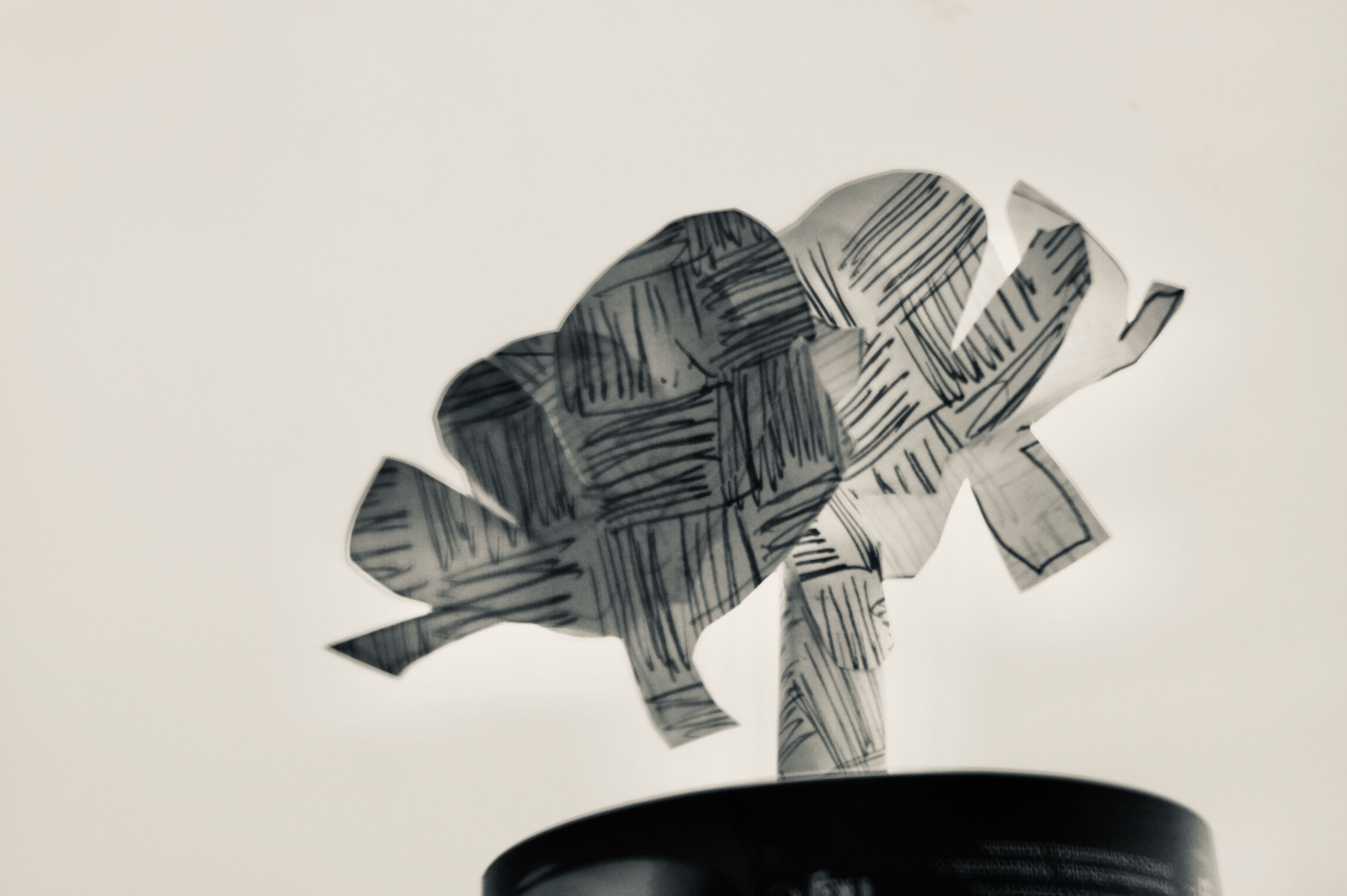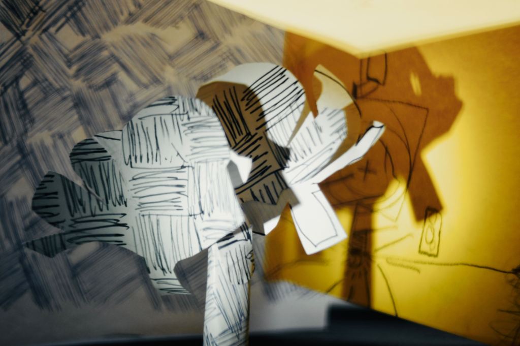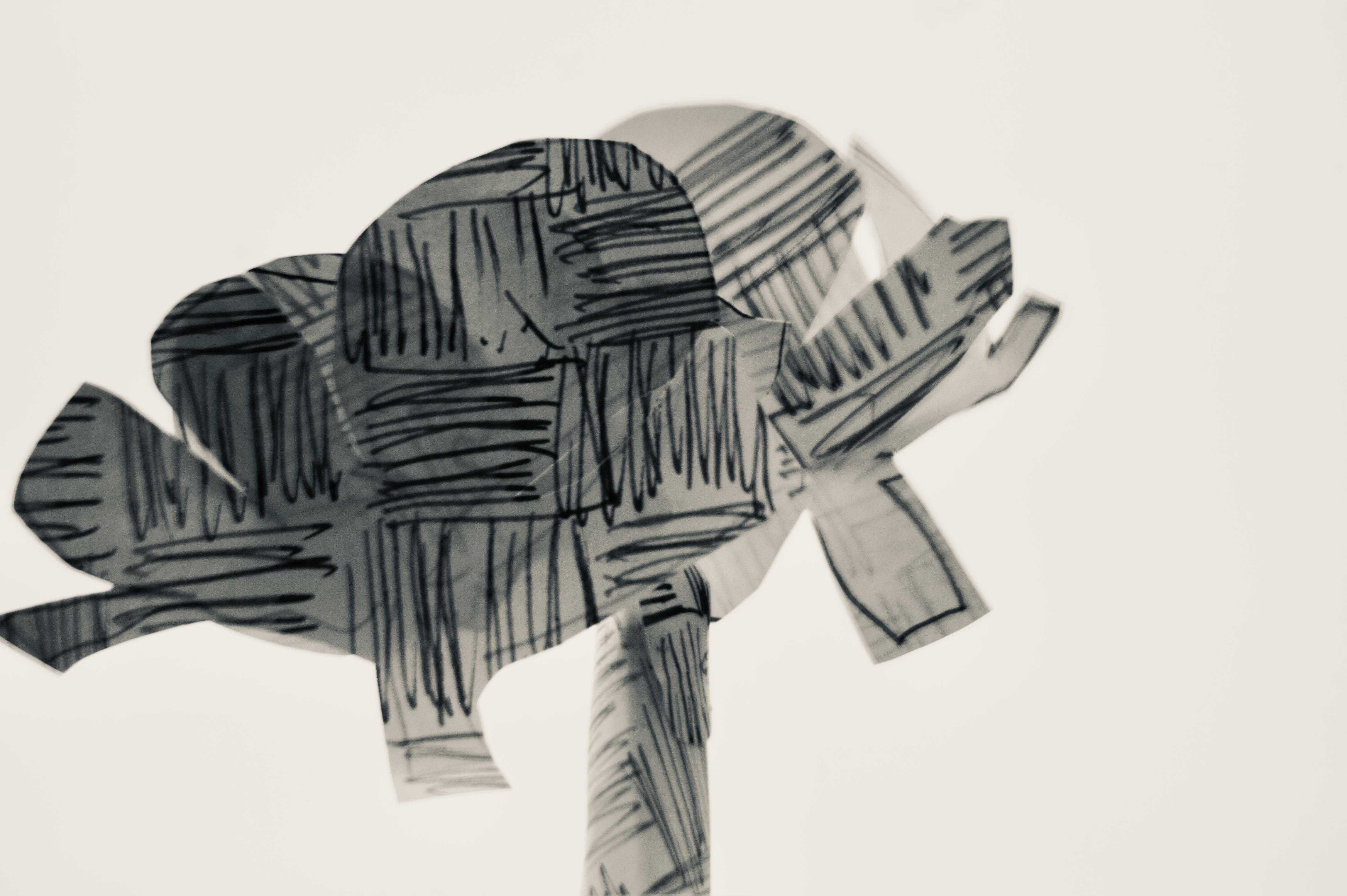 Das sagt Buchalov zu seinen Fotos: „Diesmal mache ich anders: ich werde nicht zufällig nach dem Nachfolgemotiv suchen, und diesen Vorgang dann beschreiben. Nein, diesmal schreibe ich zuerst nieder, was ich mir denke, und danach suche ich fotografisch das, was dazu passt. Ein Blatt Papier und viele Stengel sind die Gegenstände, die mich im Vorgängerbild des Löwen anspringen. Ich werde in den Stapel meiner Reste- und Kritzeleien eintauchen, mein Enkelsohn Titus hat da so einiges auf gelbem Papier hinterlassen, daraus eine kleine Papierbühne kleben, sie vor mein Dachfenster stellen, mit Papierbäumen füllen und fotografieren. Mit der Tiefenschärfe kann ich nicht rechnen und meine Propelleraufsatzblende ignoriere ich einfach. Farblich strahlend werde ich nacharbeiten und vielleicht bei den SW – Fotos einen Silberton – Filter verwenden. Stichworte sind: fotografisch bewußte Inszenierung, Arte Povera, Restepapiere, Erinnerungen an meine Kindheit und die selbstgebauten kleinen Kasperlebühnen in meinem Kinderzimmer bevor die Märklineisenbahn den Raum besetzte, Lebendigkeit und eine gebrochene Ästhetik.“