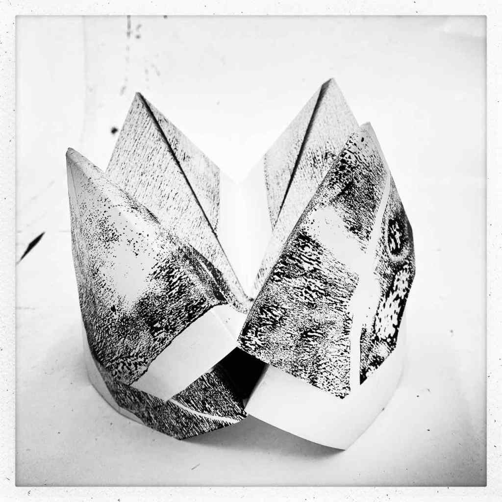 Welche Faltungen kenne ich? Gehe durch deine Räume und schaue Dir Werke an, die durch Falten entstanden sind oder an denen Faltungen vorgenommen wurden. Schneide spontan die Faltlinien als Netze in Holzplatten und drucke sie.