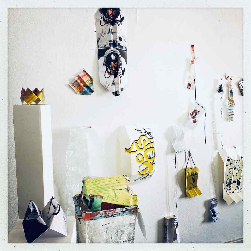 Ich habe ihn dabei beobachtet wie er das angestellt hat. Er hat aussortierte, gefaltete Papierobjekte wieder in den zweidimensionalen Zustand transferiert und die Linien mit dem Cutermesser herausgeschnitten. Der Zufall hat dann einen Teil übernommen, und Jürgen war derjenige, der das Gesamte anschließend bewertet hat. Das heisst konkret: Einiges landete an der Wand, der Rest im Mülleimer.