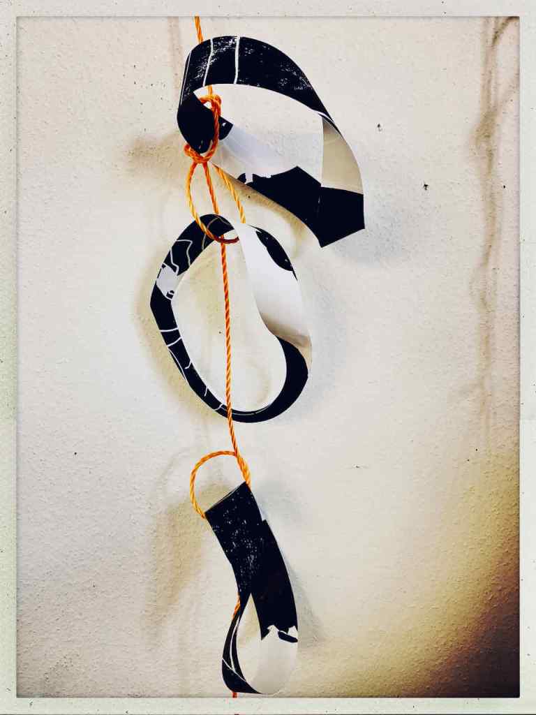Ach ja, mehrere kleine Hexentreppen haben wir ebenfalls gefaltet. Die kennt Jürgen noch aus seiner Kindergartenzeit. Er hat bewußt kleine Papierstreifen gewählt, die noch Spuren von Motiven zeigten. Na ja!