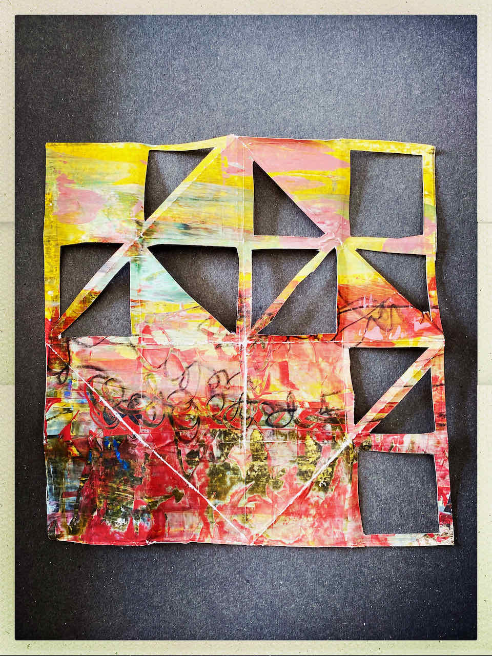 Und er hat sehr bewußt aus den Restepapieren die ausgewählt, die mit ihren Oberflächen dominant und präsent daherkamen. Denn er ahnt, dass dieser Zusammenhang von Oberfläche bzw. Motiv und den Faltungen etwas Zentrales ist und über die Qualität der zukünftigen Arbeiten entscheiden wird.